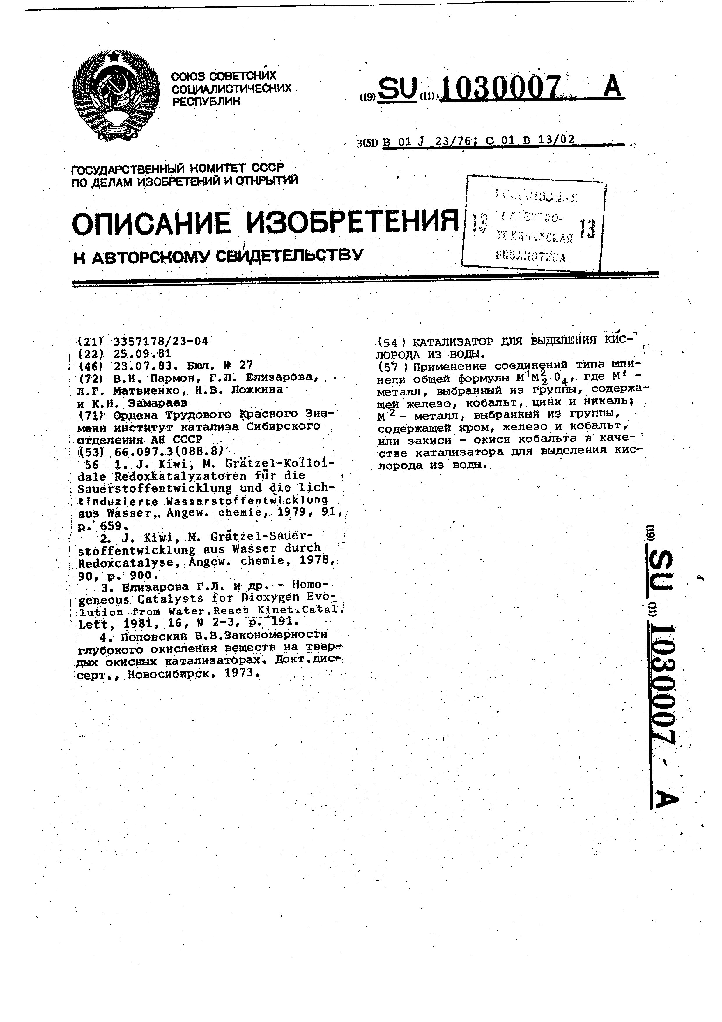 - А.с. 1030007 СССР, МПК B 01J 23/76, C01B 13/02. Катализатор для выделения кислорода из воды / Пармон В.Н., Елизарова Г.Л., Матвиенко Л.Г., Ложкина Н.В., Замараев К.И.; заявитель Институт катализа СО АН СССР. - N 3357178/23_04; заявл. 25.09.81; опубл. 23.07.83, Бюл. N 27. - 3 с.