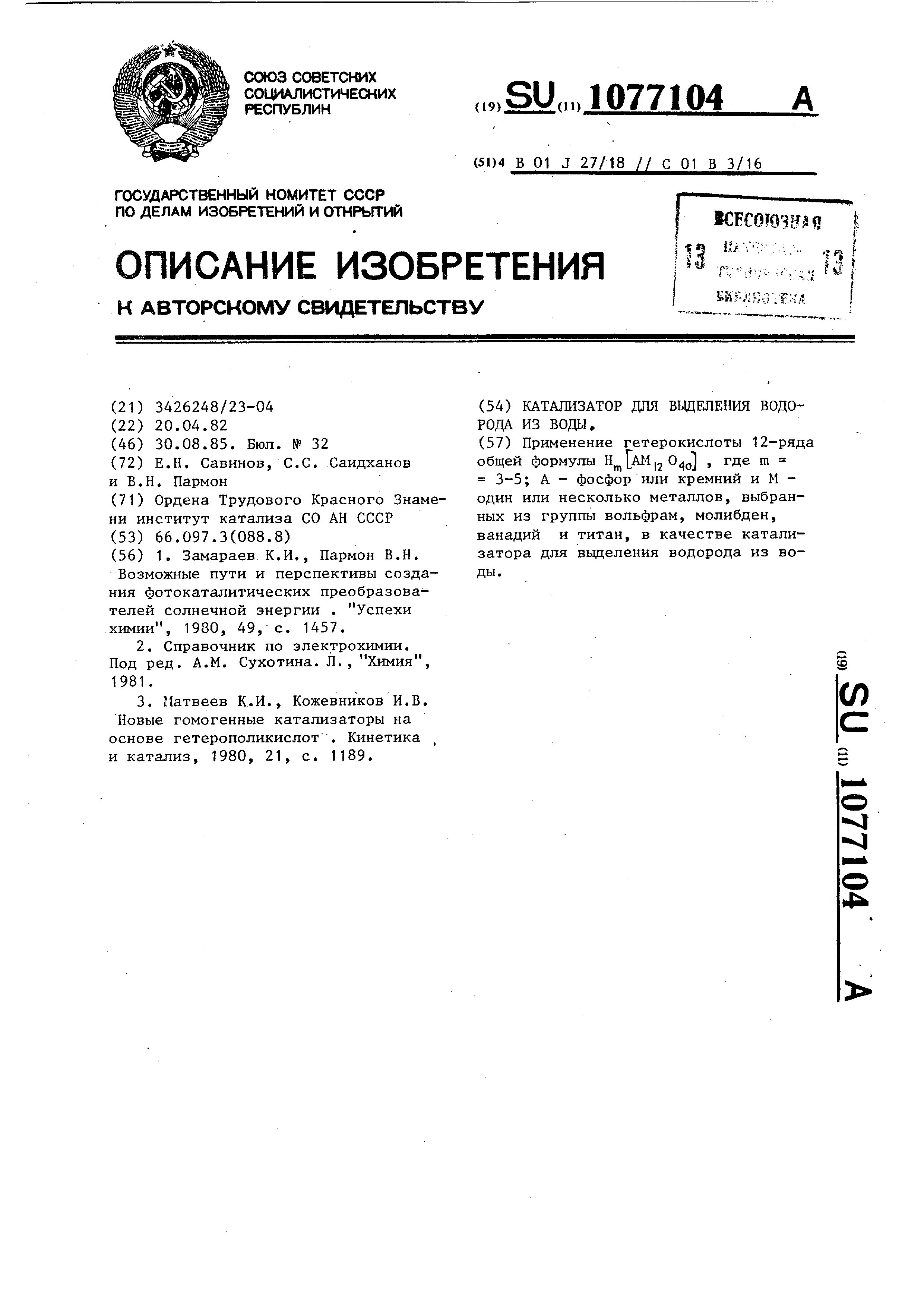 - А.с. 1077104 СССР, МПК В01J 27/18, С01В 3/16. Катализатор для выделения водорода из воды / Савинов Е.Н., Саидханов С.С., Пармон В.Н.; заявитель Институт катализа СО АН СССР. - N 3426248/23_04; заявл. 20.04.82; опубл. 30.08.85, Бюл. N 32. - 3 с.