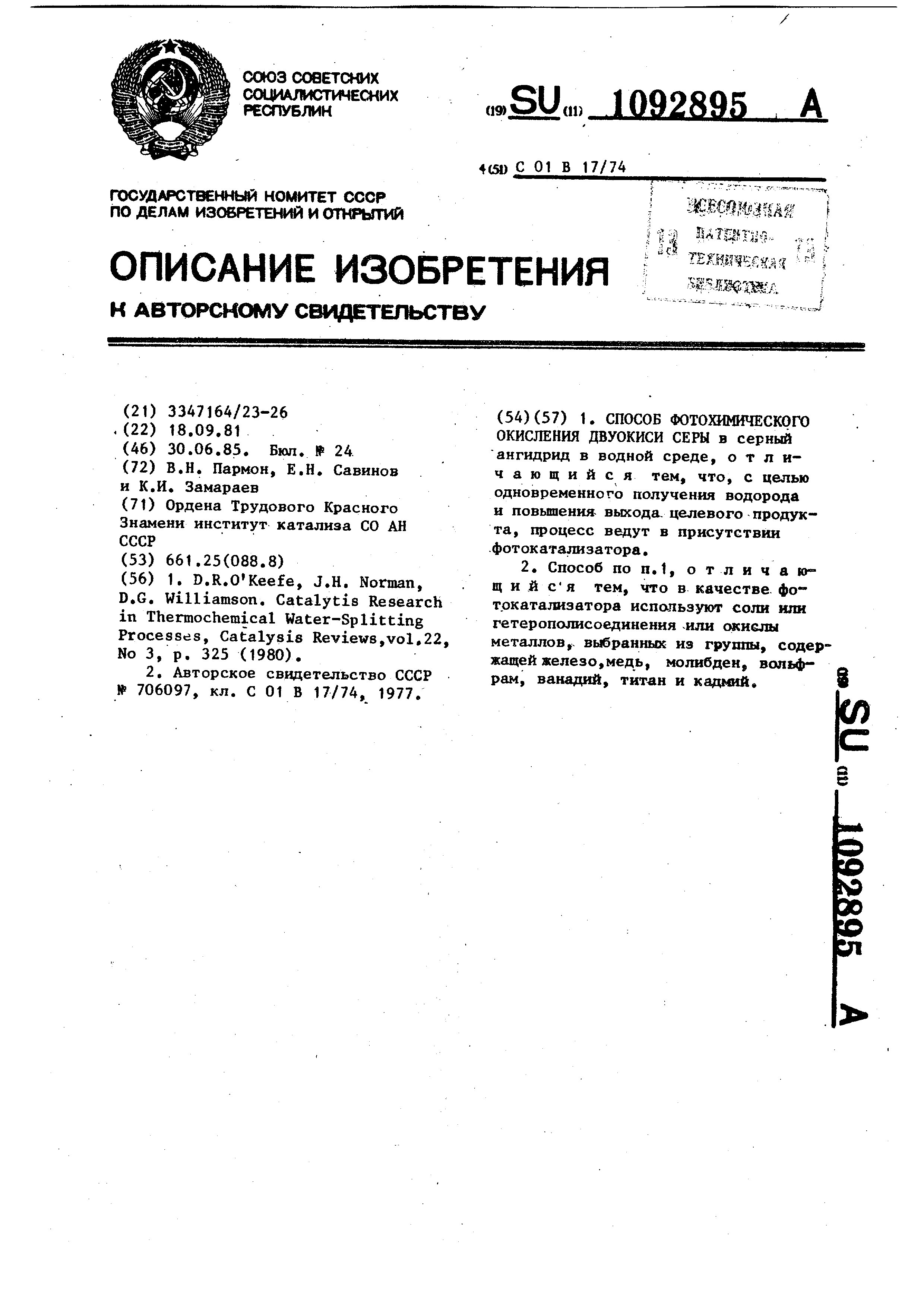- А.с. 1092895 СССР, МПК С01В 17/74. Способ фотохимического окисления двуокиси серы в серный ангидрид в водной среде / Пармон В.Н., Савинов Е.Н., Замараев К.И.; заявитель Институт катализа СО АН СССР. - N 3347164/23_26; заявл. 18.09.81; опубл. 30.06.85, Бюл. N 24. - 4 с.