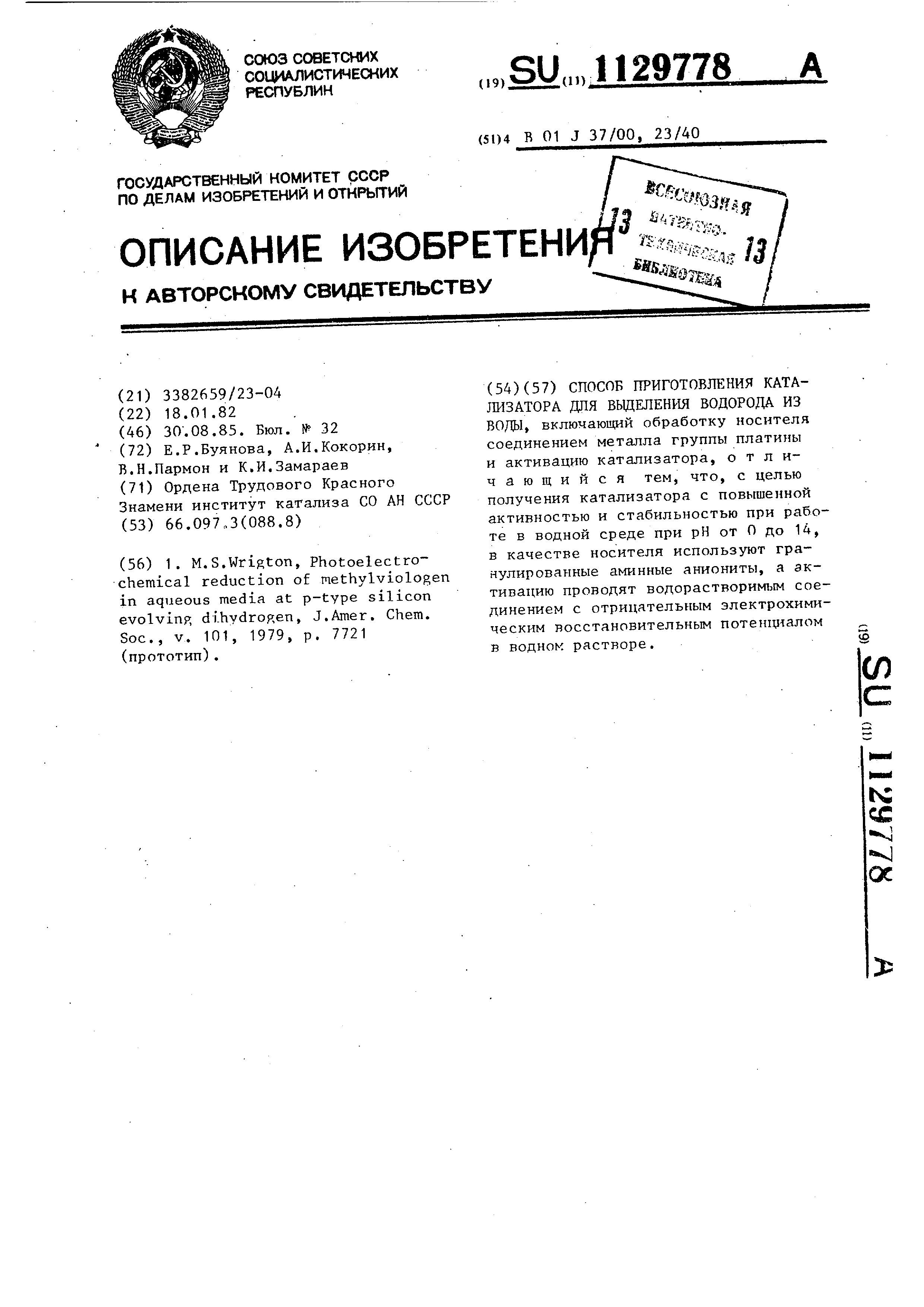 - А.с. 1129778 СССР, МПК B01J 37/00, B01J 23/40. Способ приготовления катализатора для выделения водорода из воды / Буянова Е.Р., Кокорин А.И., Пармон В.Н., Замараев К.И.; заявитель Институт катализа СО АН СССР. - N 3382659/23_04; заявл. 18.01.82; опубл. 30.08.85, Бюл. N 32. - 3 с.