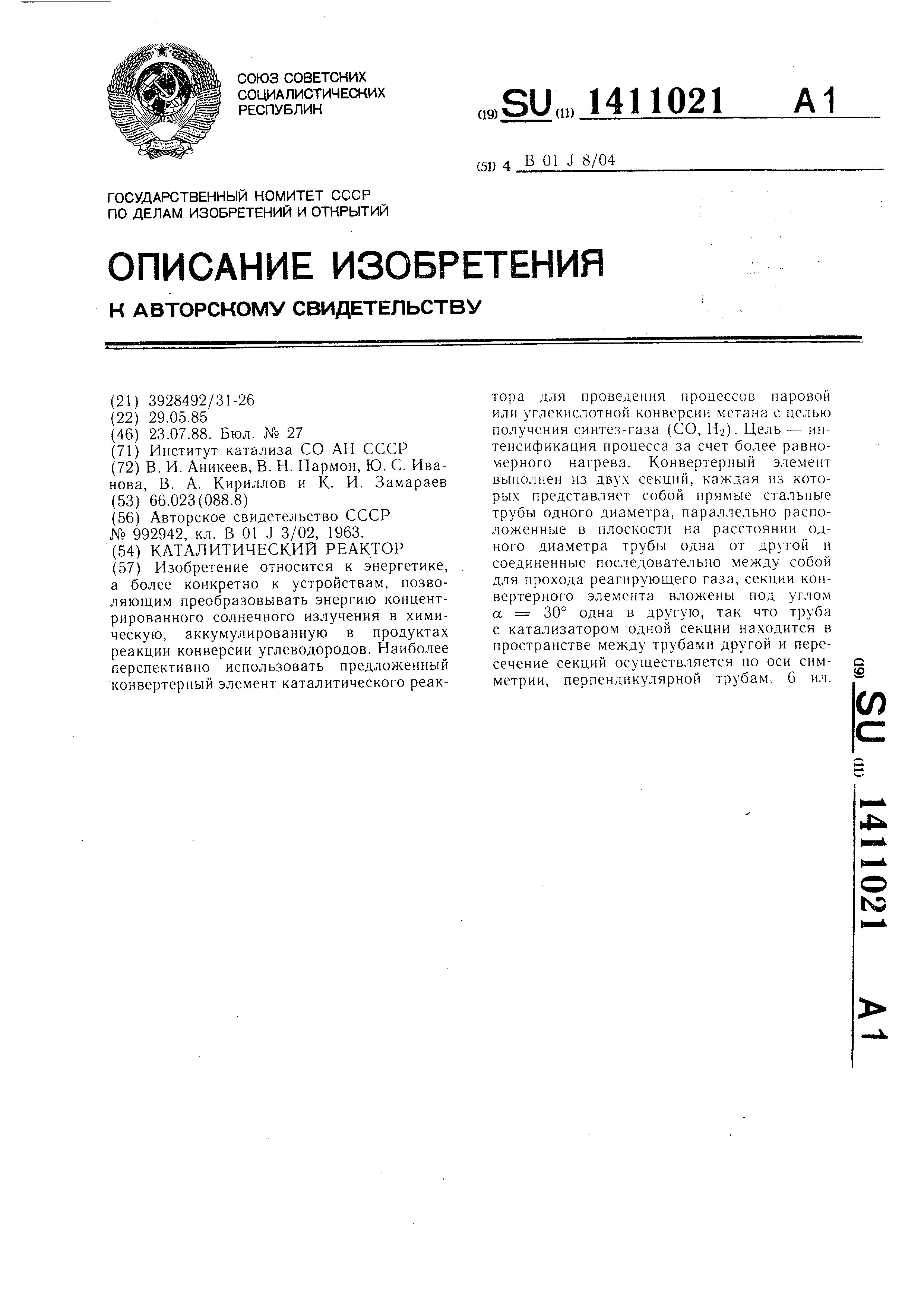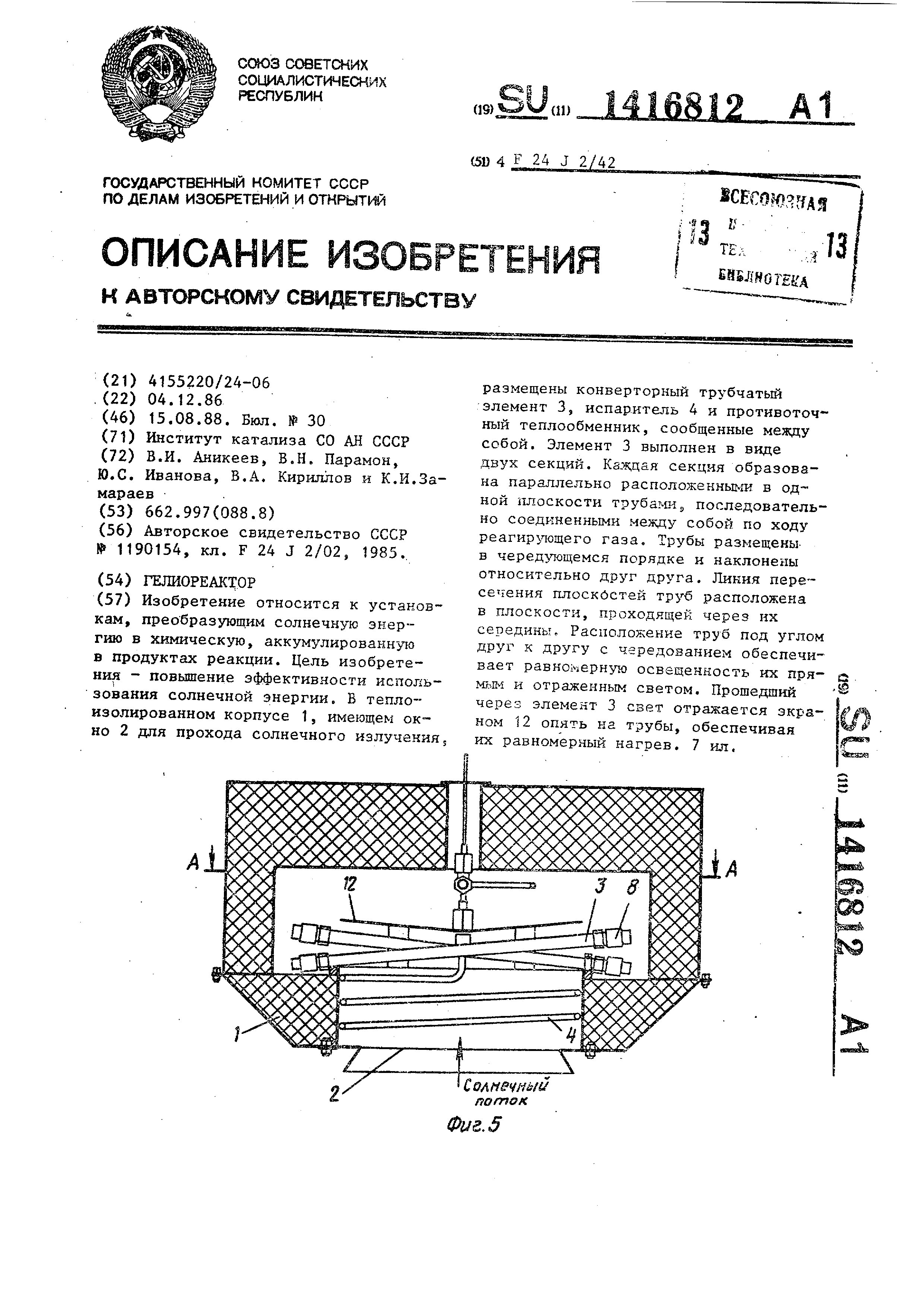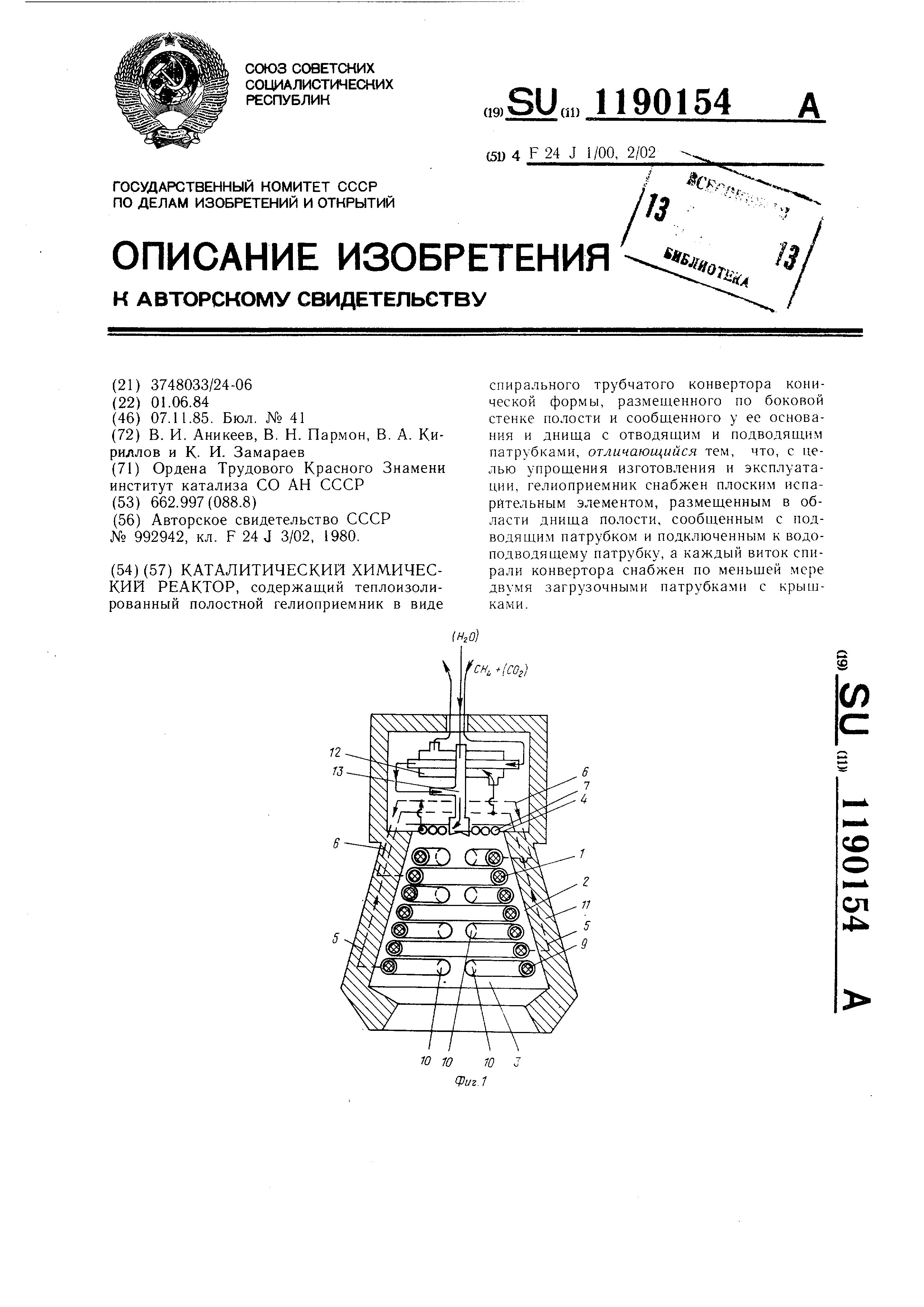 - А.с. 1190154 СССР, МПК F24J 1/00, F24J 2/02. Каталитический химический реактор / Аникеев В.И., Пармон В.Н., Кириллов В.А., Замараев К.И.; заявитель Институт катализа СО АН СССР. - N 3748033/24_06; заявл. 01.06.84; опубл. 07.11.85, Бюл. N 41. - 3 с.