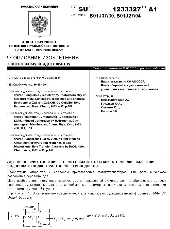 - А.с. 1233327 СССР, МПК B01J 37/30, B01J 27/04. Способ приготовления гетерогенных фотокатализаторов для выделения водорода из водных растворов сероводорода / Махмадмуродов А., Груздков Ю.А., Савинов Е.Н., Пармон В.Н.; заявитель Институт катализа СО АН СССР, Новосибирский государственный университет. - N 3777664/04; заявл. 03.08.84; опубл. 30.10.94, Бюл. N 20. - 3 с.