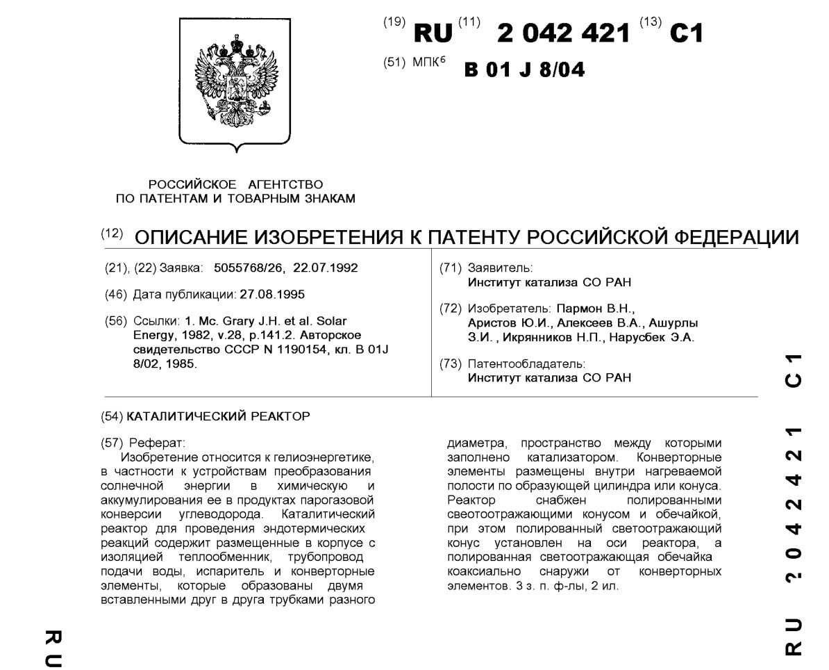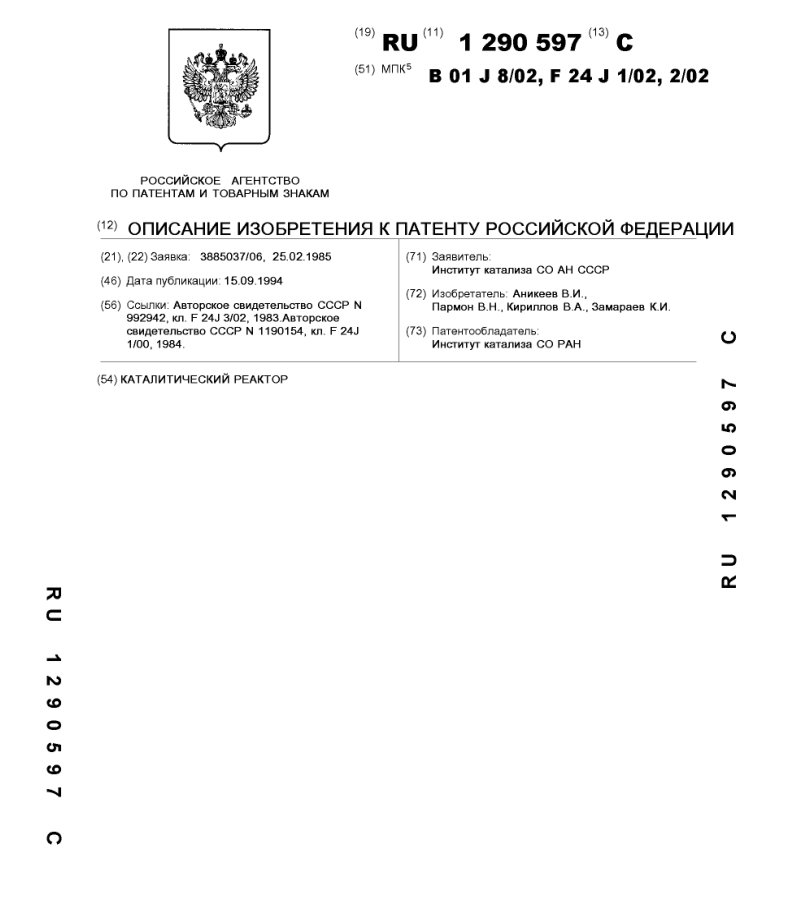 - Пат. 2042421 Российской Федерации, МПК B01J 8/04. Каталитический реактор / Пармон В.Н., Аристов Ю.И., Алексеев В.А., Ашурлы З.И., Икрянников Н.П., Нарусбек Э.А.; патентообладатель Институт катализа СО РАН. - N 5055768/26; заявл. 22.07.92; опубл. 27.08.95, Бюл. N 24. - 5 с.: ил.