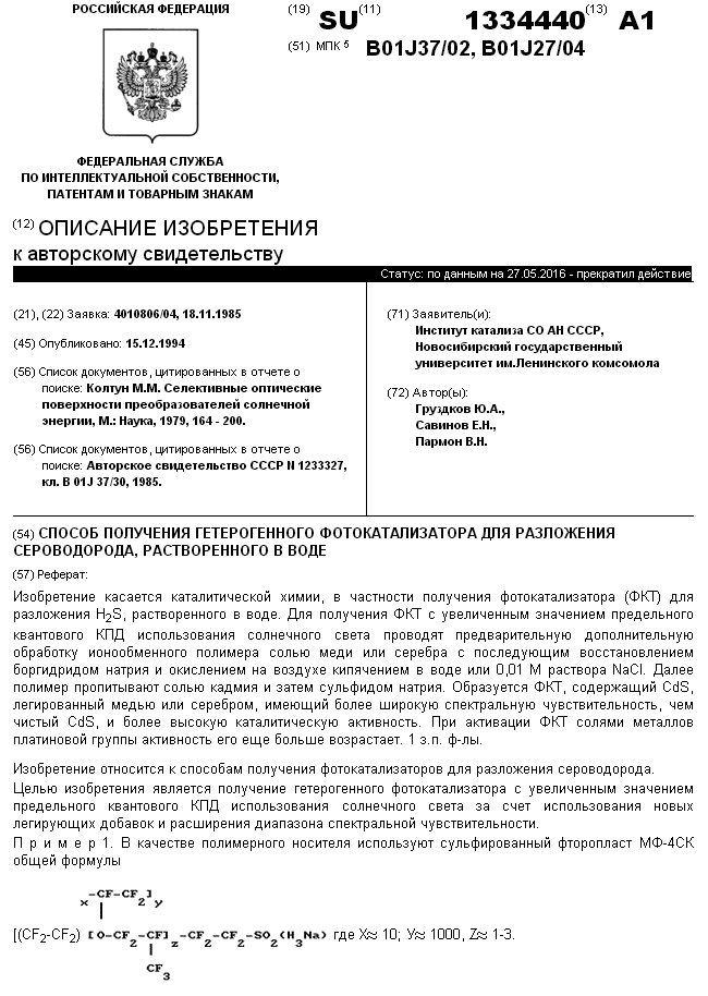 - А.с. 1334440 СССР, МПК B01J 37/02, B01J 27/04. Способ получения гетерогенного фотокатализатора для разложения сероводорода, растворенного в воде / Груздков Ю.А., Савинов Е.Н., Пармон В.Н.; заявители Институт катализа СО АН СССР, Новосибирский государственный университет. - N 4010806/04; заявл. 18.11.85; опубл. 15.12.94, Бюл. N 23. - 3 с.
