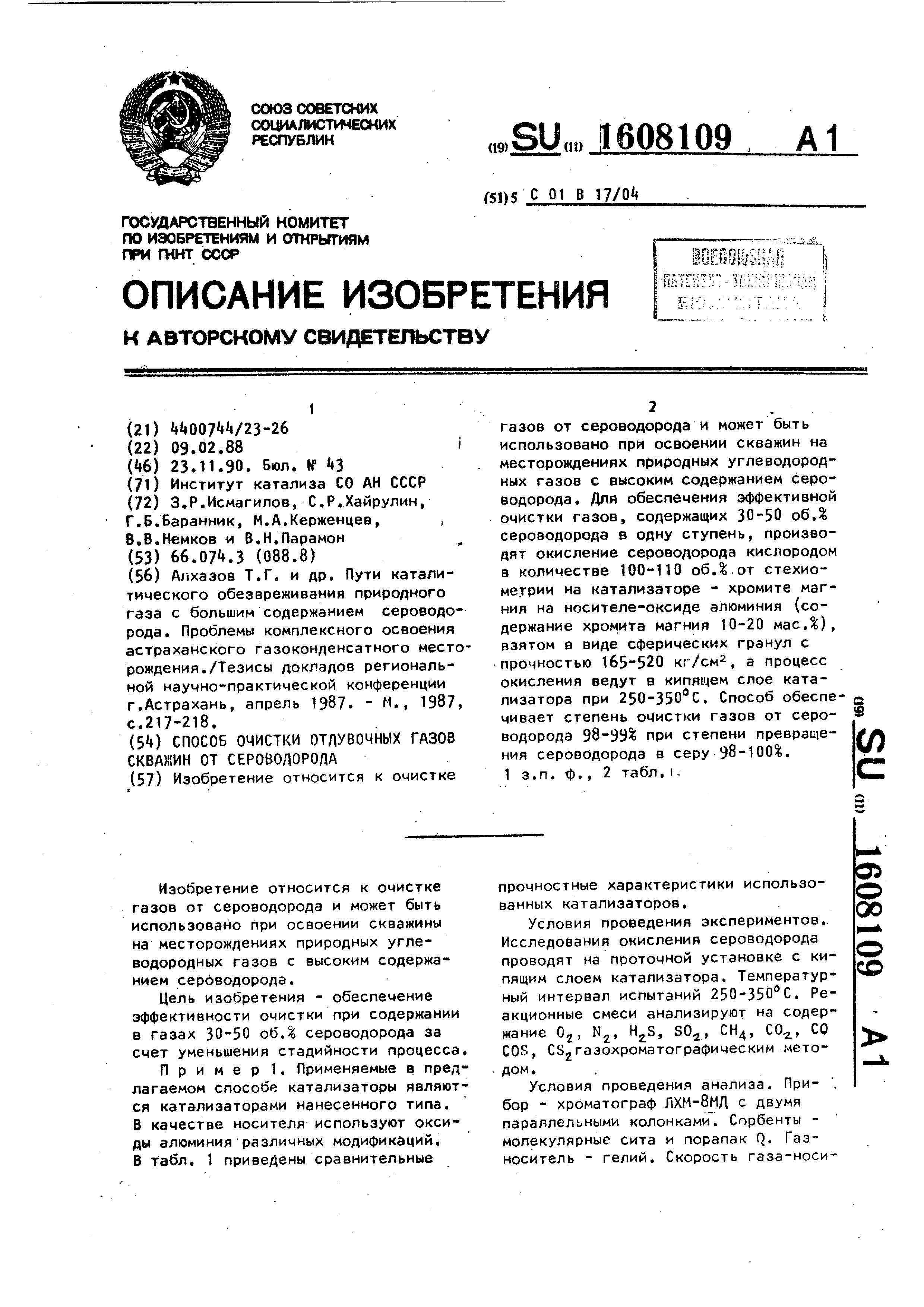 - А.с. 1608109 СССР, МПК C01B 17/04. Способ очистки отдувочных газов скважин от сероводорода / Исмагилов З.Р., Хайрулин С.Р., Баранник Г.Б., Керженцев М.А., Немков В.В., Пармон В.Н.; заявитель Институт катализа СО АН СССР. - N 4400744/23_26; заявл. 09.02.88; опубл. 23.11.90, Бюл. N 43. - 4 с.
