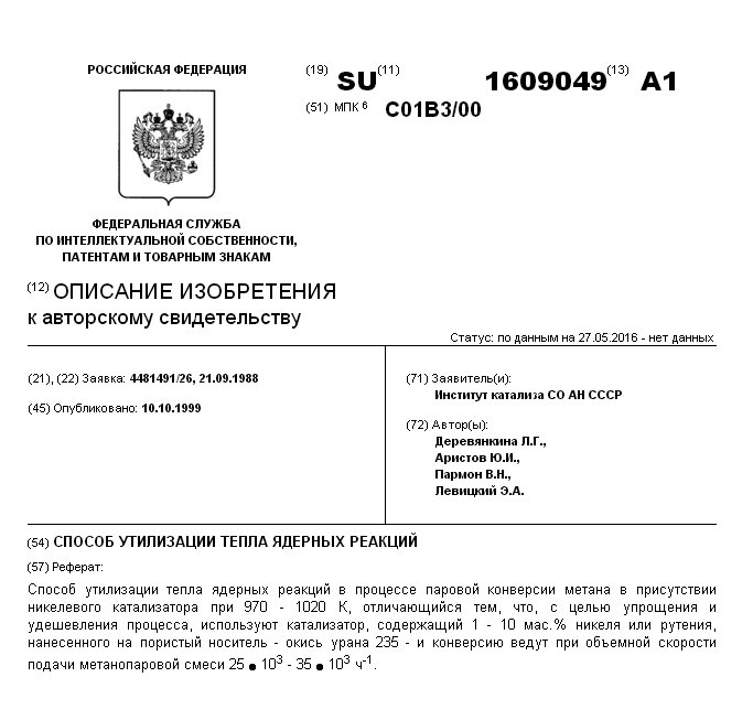 - А.с. 1609049 СССР, МПК C01B 3/00. Способ утилизации тепла ядерных реакций / Деревянкина Л.Г., Аристов Ю.И., Пармон В.Н., Левицкий Э.А.; заявитель Институт катализа СО АН СССР. - N 4481491/26; заявл. 21.09.88; опубл. 10.10.99, Бюл. N 28, ч. II. - 2 с.