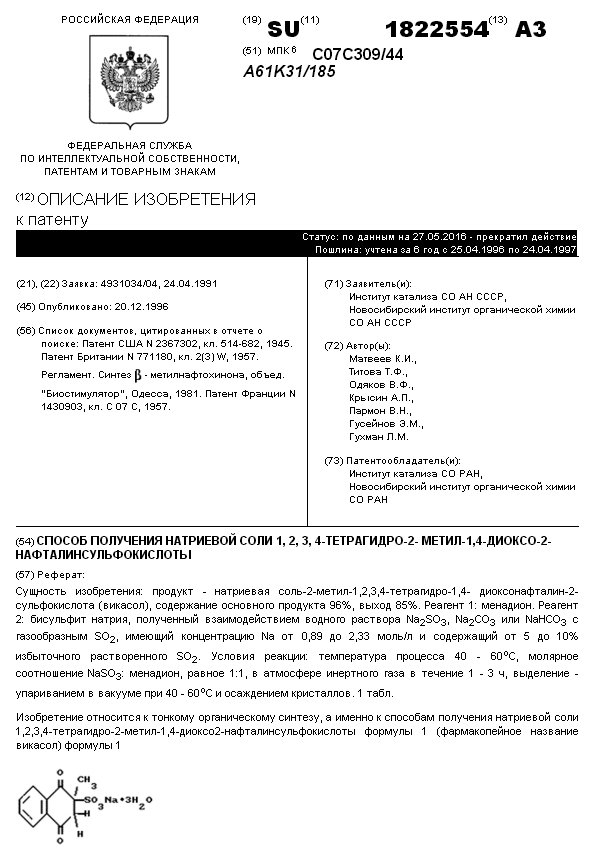 - Пат. 1822554 СССР, МПК C07C 309/44, A61K 31/185. Способ получения натриевой соли 1,2,3,4-тетрагидро-2-метил-1,4-диоксо-2-нафталинсульфокислоты / Матвеев К.И., Титова Т.Ф., Одяков В.Ф., Крысин А.П., Пармон В.Н., Гусейнов Э.М., Гухман Л.М.; патентообладатели Институт катализа СО АН СССР; Новосибирский институт органической химии СО РАН. - N 4931034/04; заявл. 24.04.91; опубл. 20.12.96, Бюл. N 35. - 8 с.