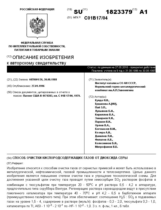 - А.с. 1823379 СССР, МПК C01B 17/04. Способ очистки кислородсодержащих газов от диоксида серы / Кундо Н.Н., Ермакова А.(HU), Пай З.П., Лукьянов Б.Н., Кириллов В.А., Замараев К.И., Пармон В.Н., Орлов В.А., Богомазов В.М., Козюра А.И., Данилов Л.И., Филатов А.В., Колесников Б.И., Митрофанов В.Б.; заявители Институт катализа СО АН СССР; Норильский горно-металлургический комбинат. - N 4478601/26; заявл. 30.08.88; опубл. 27.01.96, Бюл. N 3. - 10 с.: ил.