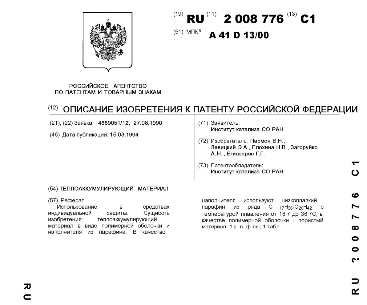 - Пат. 2008776 Российской Федерации, МПК A41D 13/00. Теплоаккумулирующий материал / Пармон В.Н., Левицкий Э.А., Елохина Н.В., Загоруйко А.Н., Егиазарян Г.Г.; патентообладатель Институт катализа СО РАН. - N 4889051/12; заявл. 27.08.90; опубл. 15.03.94, Бюл. N 5. - 8 с.: ил.