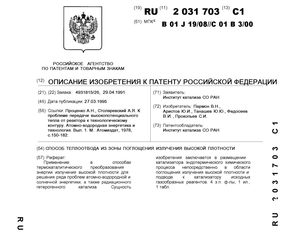 - Пат. 2031703 Российской Федерации, МПК B01J 19/08, C01B 3/00. Способ теплоотвода из зоны поглощения излучения высокой плотности / Пармон В.Н., Аристов Ю.И., Танашев Ю.Ю., Федосеев В.И., Прокопьев С.И.; патентообладатель Институт катализа СО РАН. - N 4931815/26; заявл. 29.04.91; опубл. 27.03.95, Бюл. N 9. - 8 с.: ил.