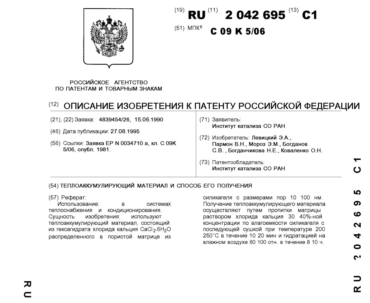 - Пат. 2042695 Российской Федерации, МПК C09K 5/06. Теплоаккумулирующий материал и способ его получения / Левицкий Э.А., Пармон В.Н., Мороз Э.М., Богданов С.В., Богданчикова Н.Е., Коваленко О.Н.; патентообладатель Институт катализа СО РАН. - N 4839454/26; заявл. 15.06.90; опубл. 27.08.95, Бюл. N 24. - 3 с.