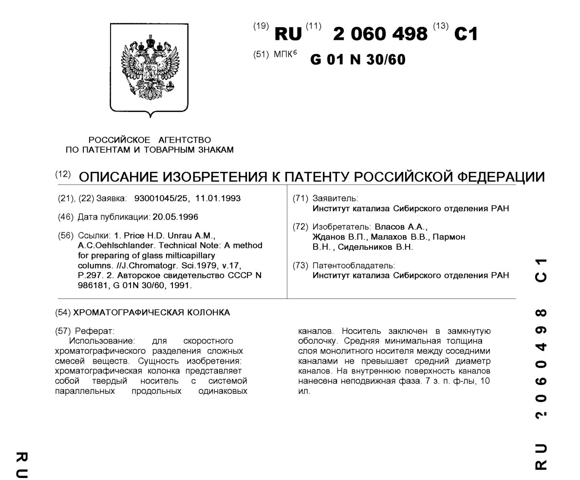 - Пат. 2060498 Российской Федерации, МПК G01N 30/60. Хроматографическая колонка / Власов А.А., Жданов В.П., Малахов В.В., Пармон В.Н., Сидельников В.Н.; патентообладатель Институт катализа СО РАН. - N 93001045/25; заявл. 11.01.93; опубл. 20.05.96, Бюл. N 14. - 15 с.: ил.