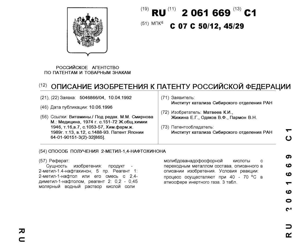 - Пат. 2022958 Российской Федерации, МПК C07C 50/12. Способ получения 2-метил-1,4-нафтохинона / Матвеев К.И., Крысин А.П., Титова Т.Ф., Хлебников Б.М., Одяков В.Ф., Егорова Т.Г., Жижина Е.Г., Пармон В.Н.; патентообладатели Институт катализа СО РАН, Новосибирский институт органической химии СО РАН. - N 4874667/04; заявл. 13.08.90; опубл. 15.11.94, Бюл. N 21. - 13 с.: ил.