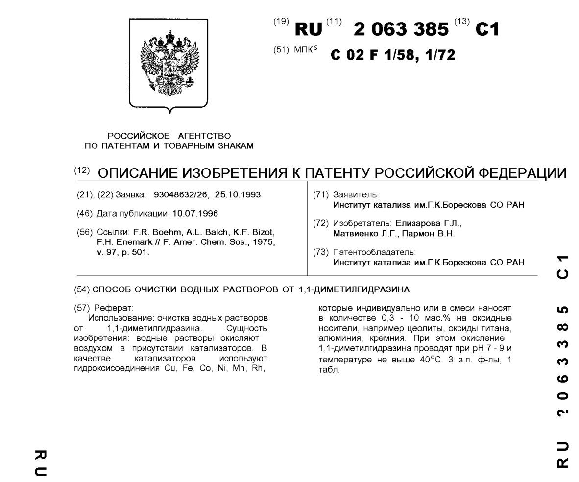 - Пат. 2063385 Российской Федерации, МПК C02F 1/58, C02F 1/72. Способ очистки водных растворов от 1,1-диметилгидразина / Елизарова Г.Л., Матвиенко Л.Г., Пармон В.Н.; патентообладатель Институт катализа СО РАН. - N 93048632/26; заявл. 25.10.93; опубл. 10.07.96, Бюл. N 19. - 4 с.: ил.