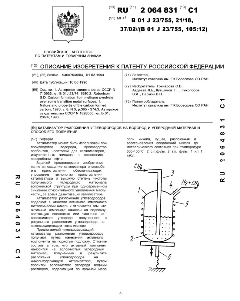 - Пат. 2064831 Российской Федерации, МПК B01J 23/755, B01J 21/18, B01J 37/02, B01J 23/755, B01J 105/12. Катализатор разложения углеводородов на водород и углеродный материал и способ его получения / Гончарова О.В., Авдеева Л.Б., Кувшинов Г.Г., Лихолобов В.А., Пармон В.Н.; патентообладатель Институт катализа СО РАН. - N 94007546/04; заявл. 01.03.94; опубл. 10.08.96, Бюл. N 22. - 8 с.: ил.