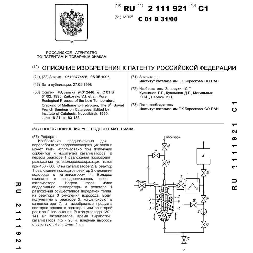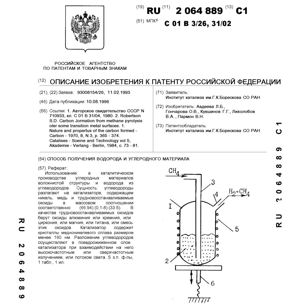 - Пат. 2064889 Российской Федерации, МПК C01B 3/26, C01B 31/02. Способ получения водорода и углеродного материала / Авдеева Л.Б., Гончарова О.В., Кувшинов Г.Г., Лихолобов В.А., Пармон В.Н.; патентообладатель Институт катализа СО РАН. - N 93008154/26; заявл. 11.02.93; опубл. 10.08.96, Бюл. N 22. - 8 с.: ил.