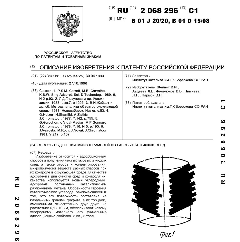 - Пат. 2068296 Российской Федерации, МПК B01J 20/20, B01D 15/08. Способ выделения микропримесей из газовых и жидких сред / Жейвот В.И., Авдеева Л.Б., Фенелонов В.Б., Пимнева Л.Г., Пармон В.Н.; патентообладатель Институт катализа СО РАН. - N 93025944/26; заявл. 30.04.93; опубл. 27.10.96, Бюл. N 30. - 9 с.: ил.