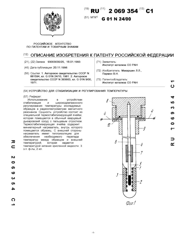 - Пат. 2069354 Российской Федерации, МПК G01N 24/00. Устройство для стабилизации и регулирования температуры / Макаршин Л.Л.; Пармон В.Н.; патентообладатель Институт катализа СО РАН. - N 93003035/25; заявл. 18.01.93; опубл. 20.11.96, Бюл. N 32. - 5 с.: ил.