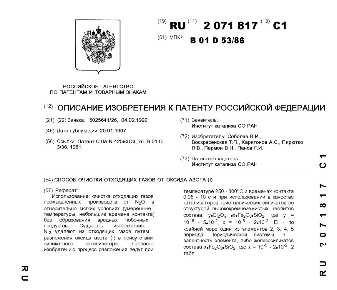 - Пат. 2071817 Российской Федерации, МПК B01D 53/86. Способ очистки отходящих газов от оксида азота (I) / Соболев В.И., Воскресенская Т.П., Харитонов А.С., Пирютко Л.В., Пармон В.Н., Панов Г.И.; патентообладатель Институт катализа СО РАН. - N 5025641/26; заявл. 04.02.92; опубл. 20.01.97, Бюл. N 2. - 6 с.: ил.