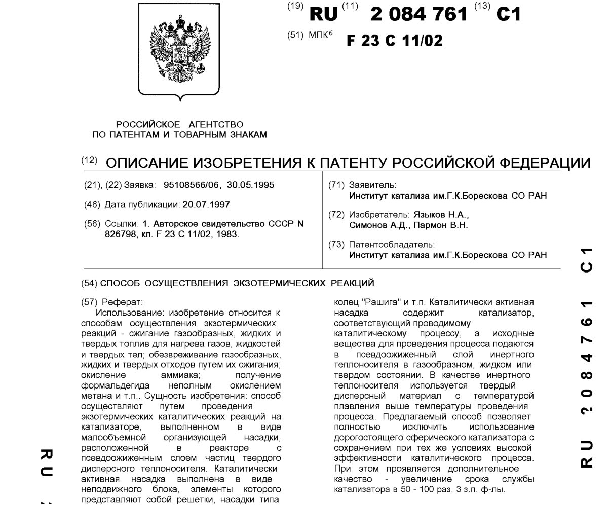 - Пат. 2084761 Российской Федерации, МПК F23C 11/02. Способ осуществления экзотермических реакций / Языков Н.А., Симонов А.Д., Пармон В.Н.; патентообладатель Институт катализа СО РАН. - N 95108566/06; заявл. 30.05.95; опубл. 20.07.97, Бюл. N 20, ч. ІІ. - 4 с.