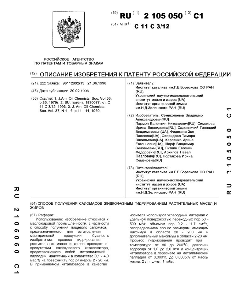 - Пат. 2105050 Российской Федерации, МПК C11C 3/12. Способ получения саломасов жидкофазным гидрированием растительных масел и жиров / Семиколенов В.А., Пармон В.Н., Симакова И.Л., Садовничий Г.В., Федякина З.П.(UA), Свиридова Т.В.(UA), Карпенко И.Е.(UA), Шарф В.З., Литвин Е.Ф., Архипов П.П., Портякова И.С.; патентообладатели Институт катализа СО РАН, Украинский научно-исследовательский институт масел и жиров(UA), Институт органической химии РАН. - N 96112992/13; заявл. 21.06.96; опубл. 20.02.98, Бюл. N 5, ч. ІІ. - 6 с.: ил.