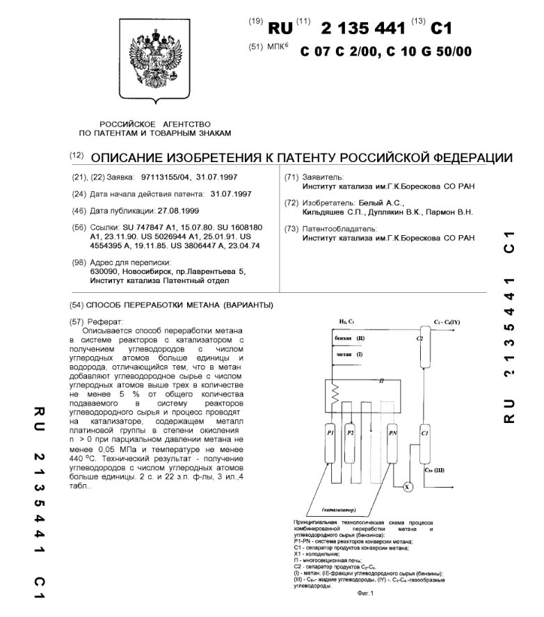 - Пат. 2135441 Российской Федерации, МПК C07C 2/00, C10G 50/00. Способ переработки метана (варианты) / Белый А.С., Кильдяшев С.П., Дуплякин В.К., Пармон В.Н.; патентообладатель Институт катализа СО РАН. - N 97113155/04; заявл. 31.07.97; опубл. 27.08.99, Бюл. N 24, ч. ІІ. - 22 с.: ил.