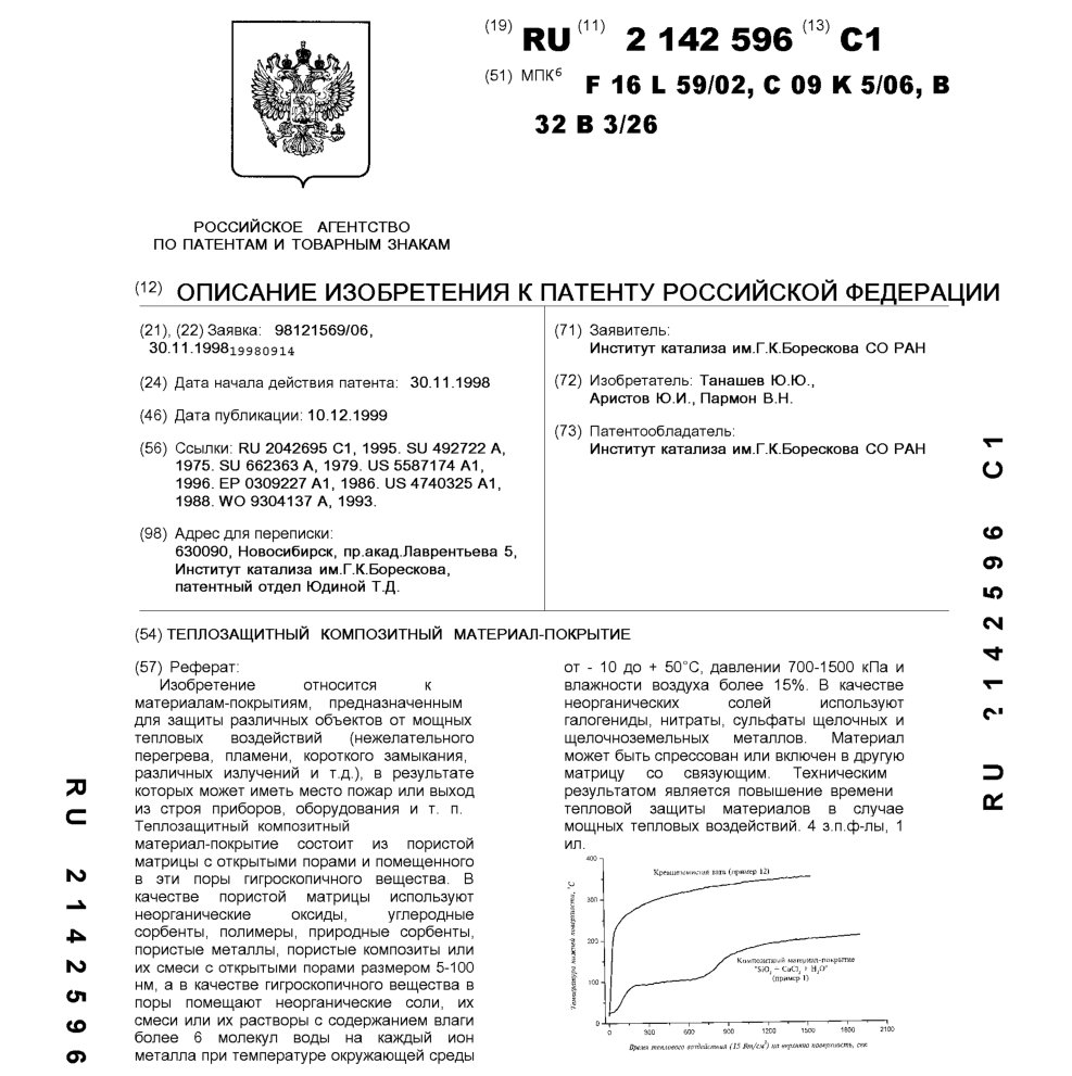 - Пат. 2142596 Российской Федерации, МПК F16L 59/02, C09K 5/06, B32B 3/26. Теплозащитный композитный материал-покрытие / Танашев Ю.Ю., Аристов Ю.И., Пармон В.Н.; патентообладатель Институт катализа СО РАН. - N 98121569/06; заявл. 30.11.98; опубл. 10.12.99, Бюл. N 34, ч. ІІ. - 5 с.: ил.
