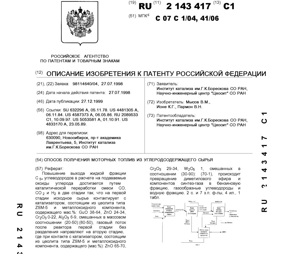 - Пат. 2143417 Российской Федерации, МПК C07C 1/04, C07C 41/06. Способ получения моторных топлив из углеродсодержащего сырья / Мысов В.М., Ионе К.Г., Пармон В.Н.; патентообладатель Институт катализа СО РАН, НИЦ «Цеосит» СО РАН. - N 98114640/04; заявл. 27.07.98; опубл. 27.12.99, Бюл. N 36. - 14 с.: ил.