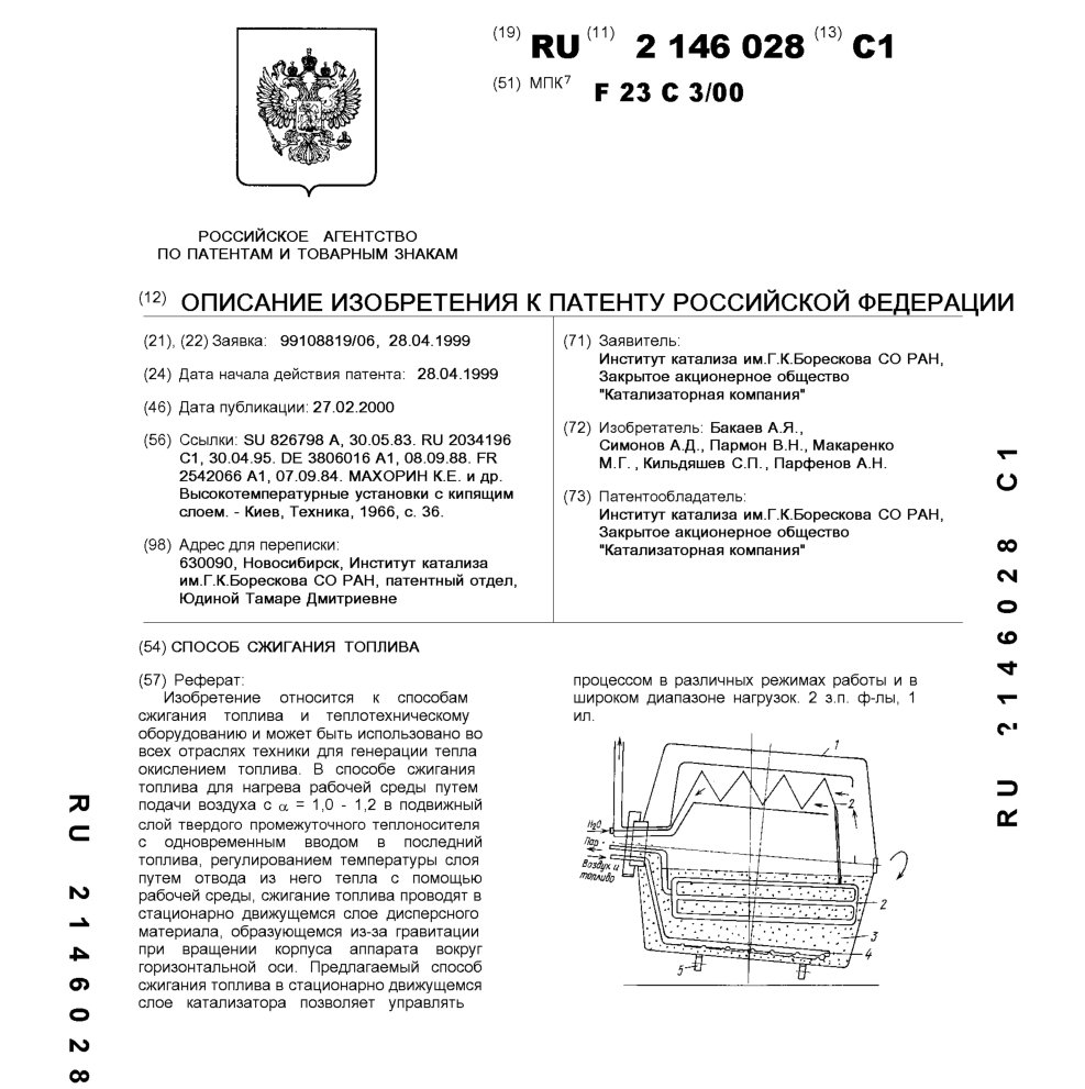 - Пат. 2146028 Российской Федерации, МПК F23C 3/00. Способ сжигания топлива / Бакаев А.Я., Симонов А.Д., Пармон В.Н., Макаренко М.Г., Кильдяшев С.П., Парфенов А.Н.; патентообладатель Институт катализа СО РАН, ЗАО «Катализаторная компания». - N 99108819/06; заявл. 28.04.99; опубл. 27.02.00, Бюл. N 6. - 5 с.: ил.