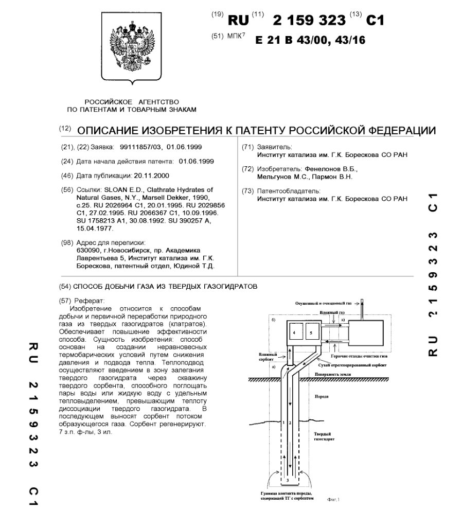 - Пат. 2159323 Российской Федерации, МПК E21B 43/00, E21B 43/16. Способ добычи газа из твердых газогидратов / Фенелонов В.Б., Мельгунов М.С., Пармон В.Н.; патентообладатель Институт катализа СО РАН. - N 99111857/03; заявл. 01.06.99; опубл. 20.11.00, Бюл. N 32, ч. ІІ. - 14 с.: ил.