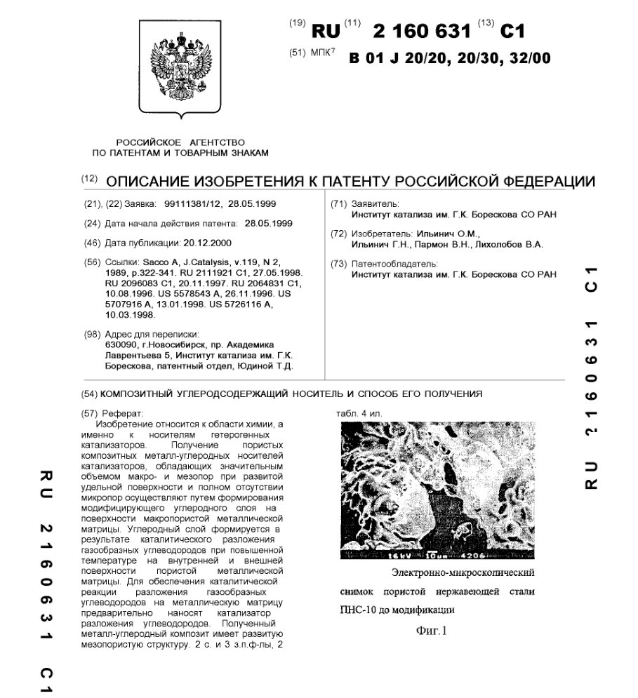 - Пат. 2160631 Российской Федерации, МПК B01J 20/20, B01J 20/30, B01J 32/00. Композитный углеродсодержащий носитель и способ его получения / Ильинич О.М., Ильинич Г.Н., Пармон В.Н., Лихолобов В.А.; патентообладатель Институт катализа СО РАН. - N 99111381/12; заявл. 28.05.99; опубл. 20.12.00, Бюл. N 35, ч. ІІ. - 11 с.: ил.