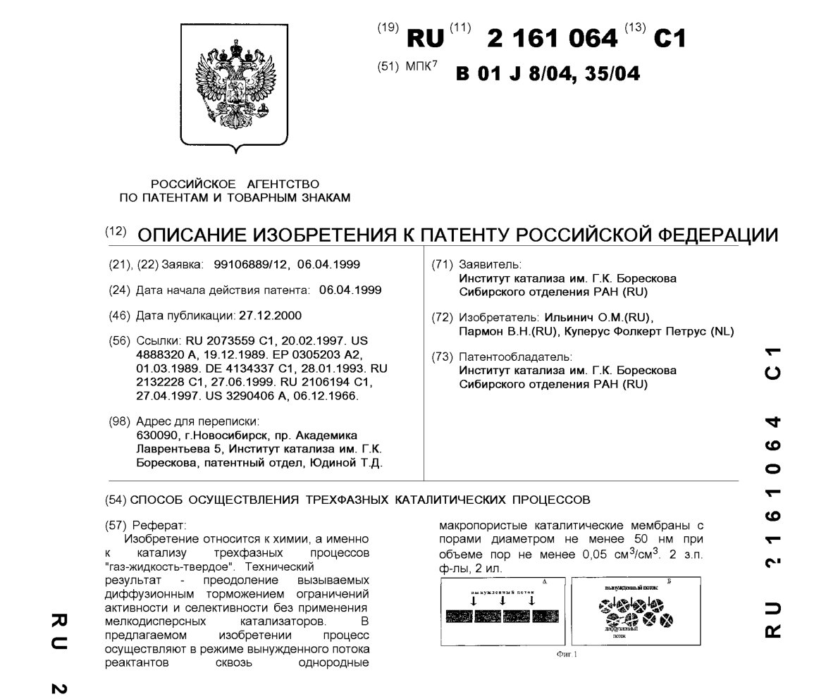 - Пат. 2161064 Российской Федерации, МПК B01J 8/04, B01J 35/04. Способ осуществления трехфазных каталитических процессов / Ильинич О.М., Пармон В.Н., Куперус Фолкерт Петрус(NL); патентообладатель Институт катализа СО РАН. - N 99106889/12; заявл. 06.04.99; опубл. 27.12.00, Бюл. N 36, ч. ІІ. - 7 с.: ил.