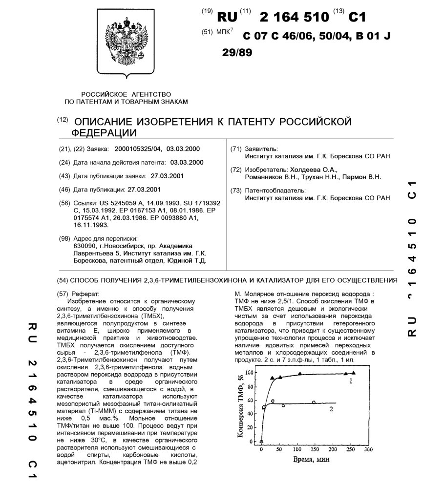 - Пат. 2164510 Российской Федерации, МПК C07C 46/06, C07C 50/04, B01J 29/89. Способ получения 2,3,6-триметилбензохинона и катализатор для его осуществления / Холдеева О.А., Романников В.Н., Трухан Н.Н., Пармон В.Н.; патентообладатель Институт катализа СО РАН. - N 2000105325/04; заявл. 03.03.00; опубл. 27.03.01, Бюл. N 9. - 8 с.: ил.
