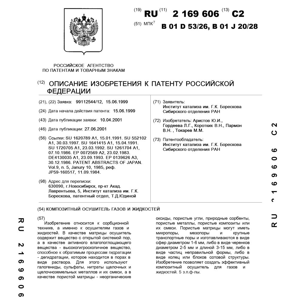 - Пат. 2169606 Российской Федерации, МПК B01D 53/26, B01J 20/28. Композитный осушитель газов и жидкостей / Аристов Ю.И., Гордеева Л.Г., Коротких В.Н., Пармон В.Н., Токарев М.М.; патентообладатель Институт катализа СО РАН. - N 99112544/12; заявл. 15.06.99; опубл. 27.06.01, Бюл. N 18, ч. ІІ. - 6 с.