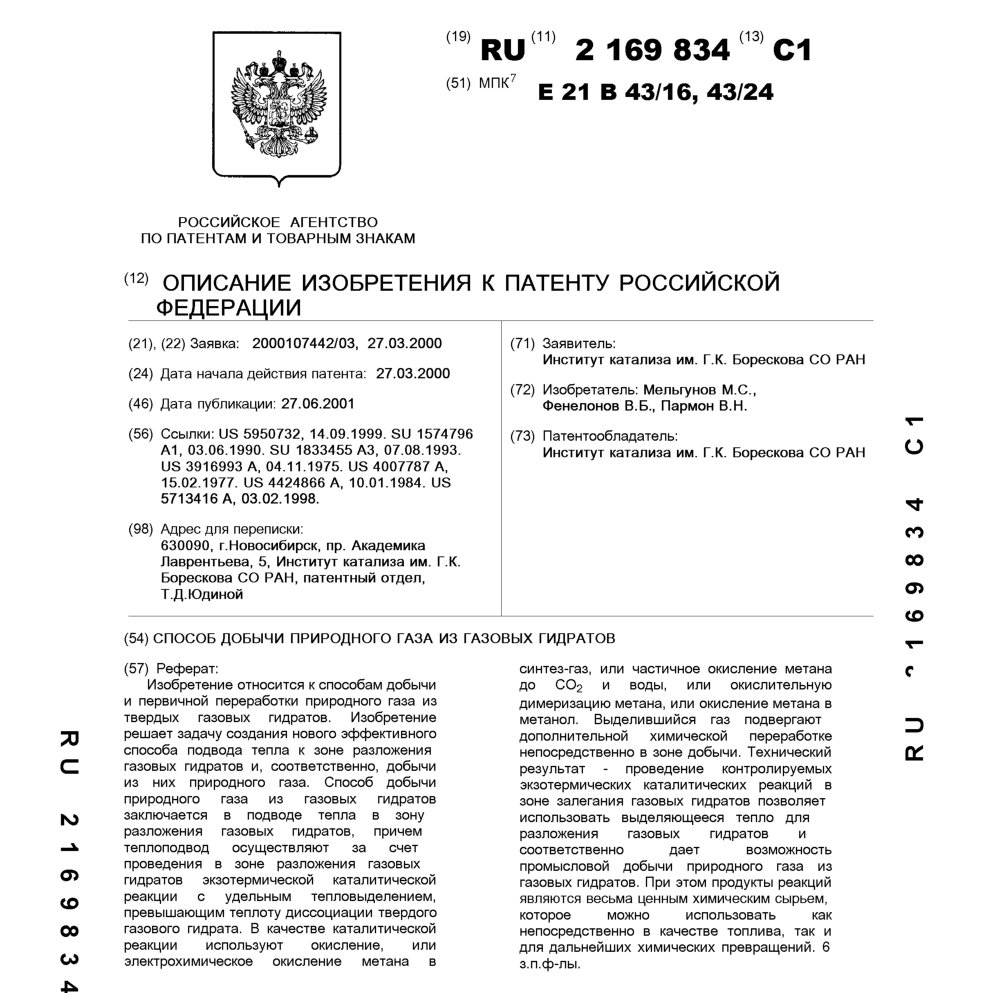- Пат. 2169834 Российской Федерации, МПК E21B 43/16, E21B 43/24. Способ добычи природного газа из газовых гидратов / Мельгунов М.С., Фенелонов В.Б., Пармон В.Н.; патентообладатель Институт катализа СО РАН. - N 2000107442/03; заявл. 27.03.00; опубл. 27.06.01, Бюл. N 18, ч. ІІ. - 6 с.