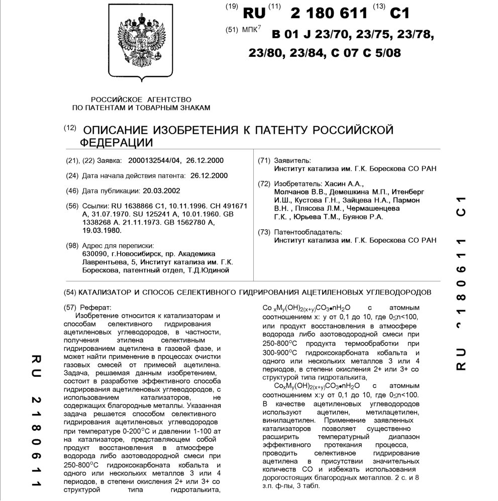 - Пат. 2180611 Российской Федерации, МПК B01J 23/70, B01J 23/75, B01J 23/78, B01J 23/80, B01J 23/84, C07C 5/08. Катализатор и способ селективного гидрирования ацетиленовых углеводородов / Хасин А.А., Молчанов В.В., Демешкина М.П., Итенберг И.Ш., Кустова Г.Н., Зайцева Н.А., Пармон В.Н., Плясова Л.М., Чермашенцева Г.К., Юрьева Т.М., Буянов Р.А.; патентообладатель Институт катализа СО РАН. - N 2000132544/04; заявл. 26.12.00; опубл. 20.03.02, Бюл. N 8. - 11 с.: ил.