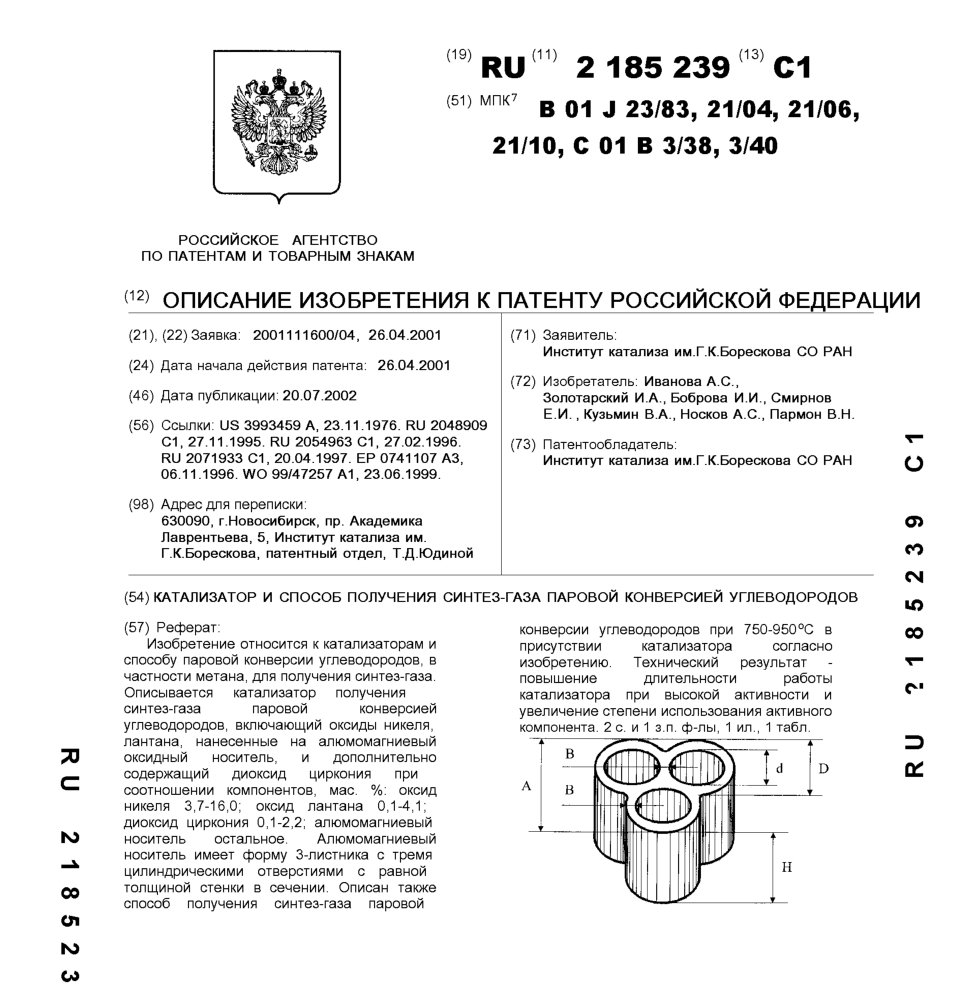 - Пат. 2185239 Российской Федерации, МПК B01 J 23/83, B01J 21/04, B01J 21/06, B01J 21/10, C01B 3/38, C01B 3/40. Катализатор и способ получения синтез-газа паровой конверсией углеводородов / Иванова А.С., Золотарский И.А., Боброва И.И., Смирнов Е.И., Кузьмин В.А., Носков А.С., Пармон В.Н.; патентообладатель Институт катализа СО РАН. - N 2001111600/04; заявл. 26.04.01; опубл. 20.07.02, Бюл. N 20, ч. ІІ. - 8 с.: ил.