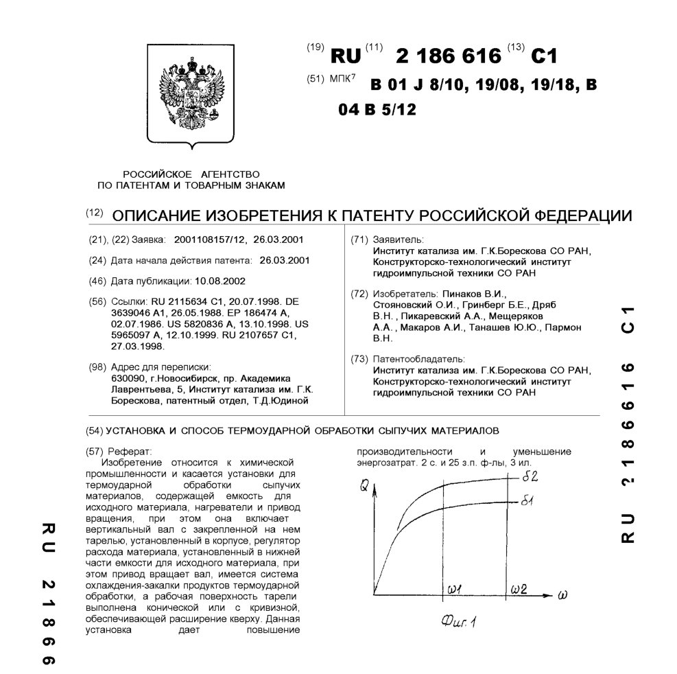 - Пат. 2186616 Российской Федерации, МПК B01J 8/10, B01J 19/08, B01J 19/18, B 04 B 5/12. Установка и способ термоударной обработки сыпучих материалов / Пинаков В.И., Стояновский О.И., Гринберг Б.Е., Дряб В.Н., Пикаревский А.А., Мещеряков А.А., Макаров А.И., Танашев Ю.Ю., Пармон В.Н.; патентообладатели Институт катализа СО РАН, Конструкторско-технологический институт гидроимпульсной техники СО РАН. - N 2001108157/12; заявл. 26.03.01; опубл. 10.08.02, Бюл. N 22, ч. ІIІ. - 10 с.: ил.