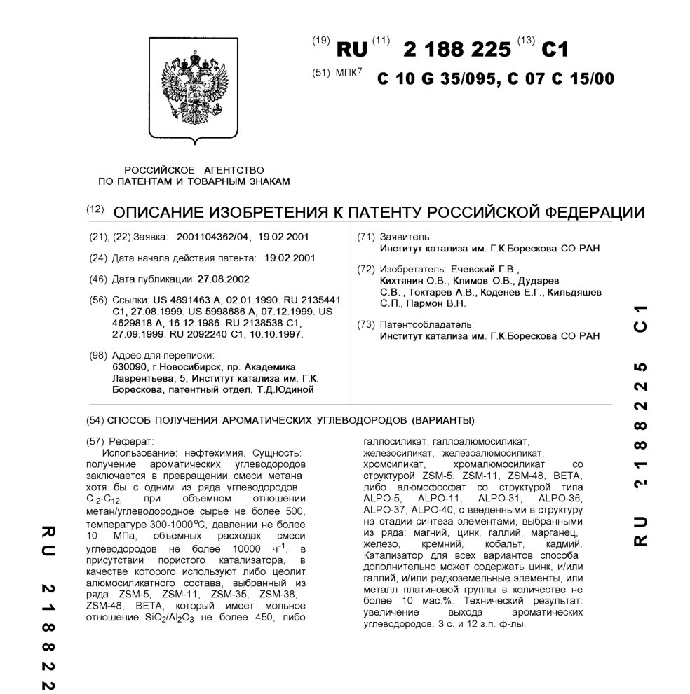 - Пат. 2188225 Российской Федерации, МПК C10G 35/095, C07C 15/00. Способ получения ароматических углеводородов (варианты) / Ечевский Г.В., Кихтянин О.В., Климов О.В., Дударев С.В., Токтарев А.В., Коденев Е.Г., Кильдяшев С.П., Пармон В.Н.; патентообладатель Институт катализа СО РАН. - N 2001104362/04; заявл. 19.02.01; опубл. 27.08.02, Бюл. N 24, ч. ІІ. - 9 с.