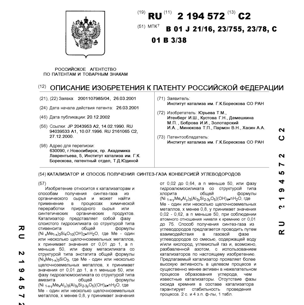 - Пат. 2194572 Российской Федерации, МПК B01J 21/16, B01J 23/755, B01J 23/78, C01B 3/38. Катализатор и способ получения синтез-газа конверсией углеводородов / Юрьева Т.М., Итенберг И.Ш., Кустова Г.Н., Демешкина М.П., Боброва И.И., Золотарский И.А., Минюкова Т.П., Пармон В.Н., Хасин А.А.; патентообладатель Институт катализа СО РАН. - N 2001107985/04; заявл. 26.03.01; опубл. 20.12.02, Бюл. N 35, ч. ІІ. - 10 с.: ил.