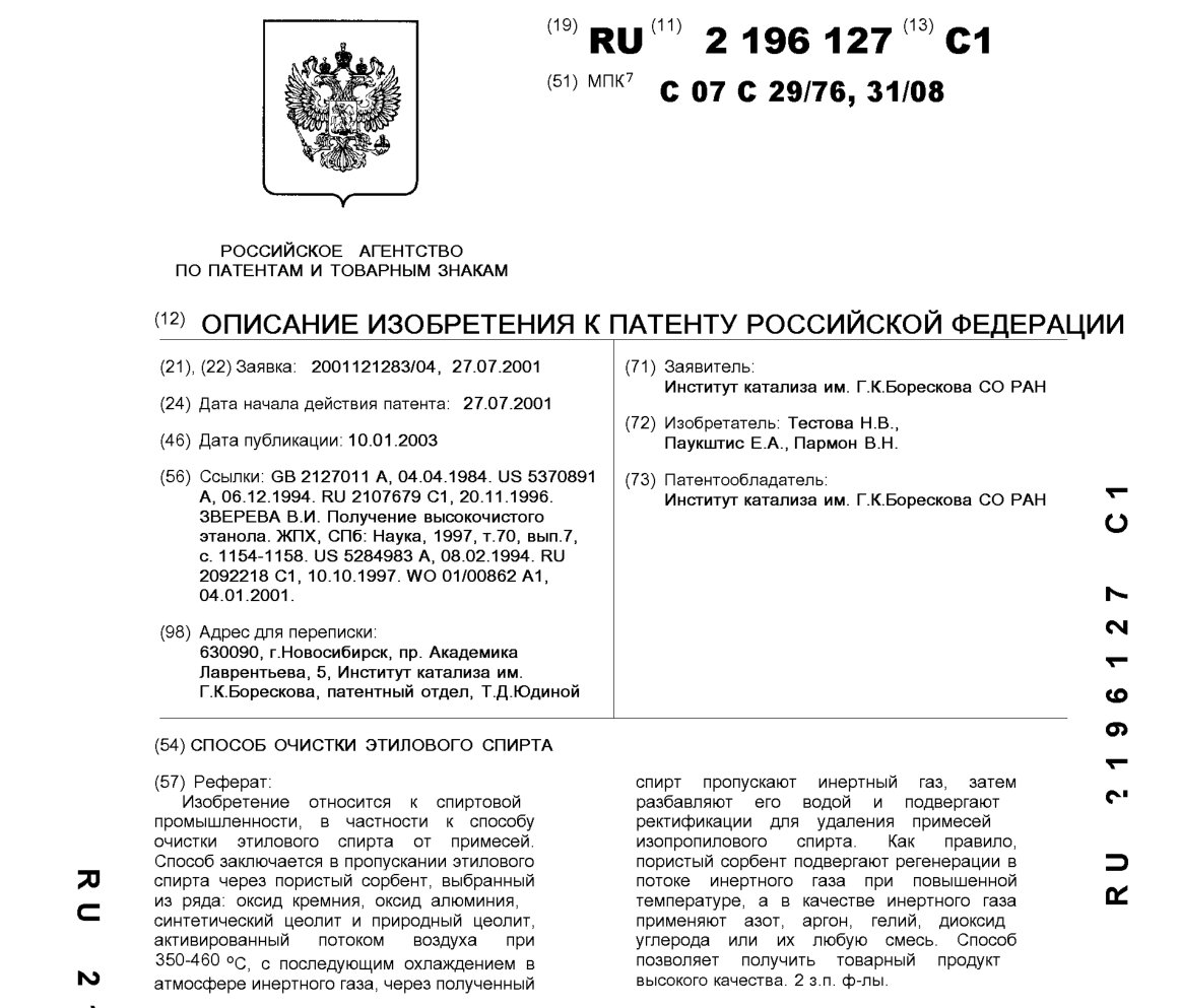 - Пат. 2196127 Российской Федерации, МПК C07C 29/76, C07C 31/08. Способ очистки этилового спирта / Тестова Н.В., Паукштис Е.А., Пармон В.Н.; патентообладатель Институт катализа СО РАН. - N 2001121283/04; заявл. 27.07.01; опубл. 10.01.03, Бюл. N 1, ч. ІІ. - 5 с.