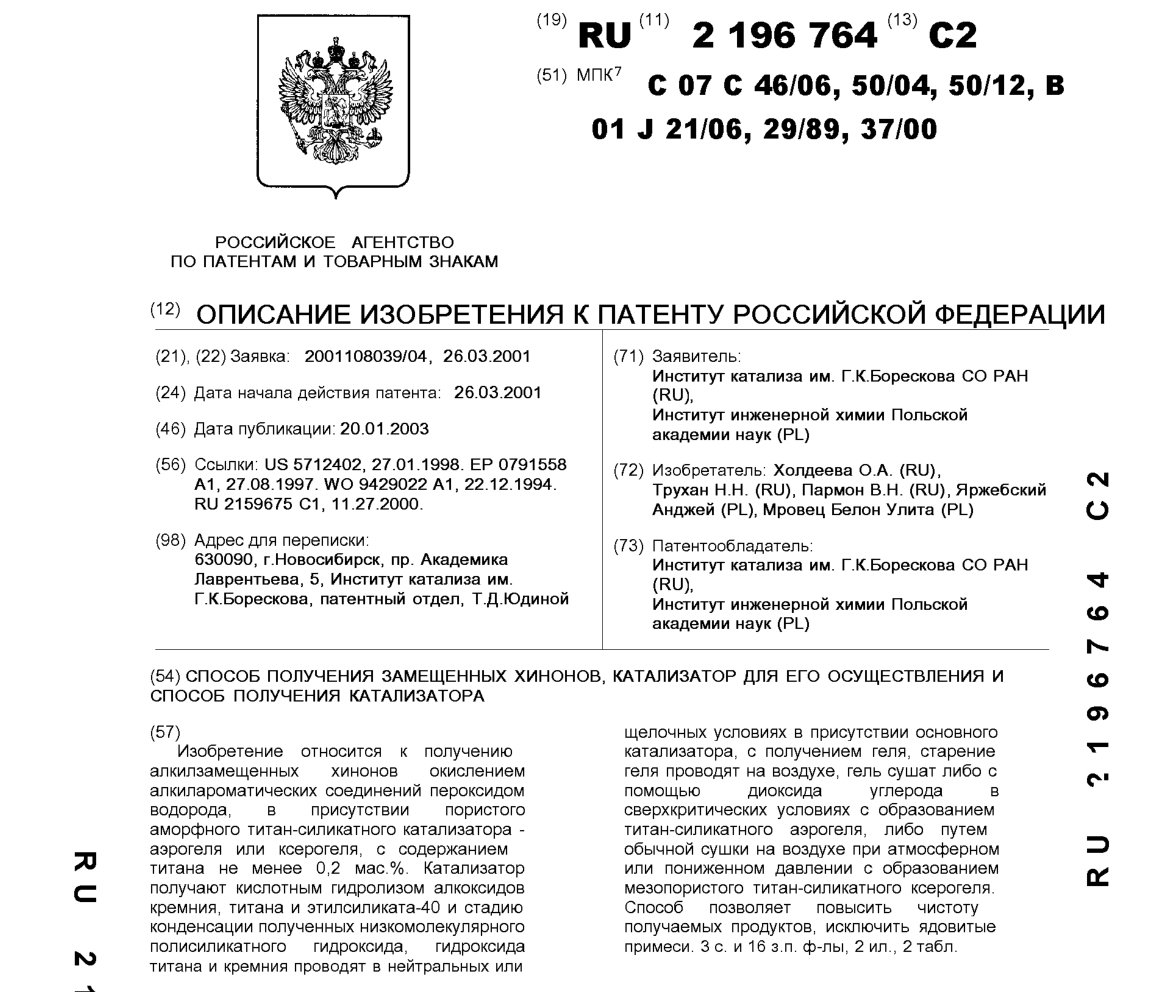 - Пат. 2196764 Российской Федерации, МПК C07C 46/06, C07C 50/04, C07C 50/12, B01J 21/06, B01J 29/89, B01J 37/00. Способ получения замещенных хинонов, катализатор для его осуществления и способ получения катализатора / Холдеева О.А., Трухан Н.Н., Пармон В.Н., Яржебский Анджей(PL), Мровец Белон Улита(PL); патентообладатели Институт катализа СО РАН, Институт инженерной химии Польской АН(PL). - N 2001108039/04; заявл. 26.03.01; опубл. 20.01.03, Бюл. N 2, ч. ІІI. - 11 с.: ил.