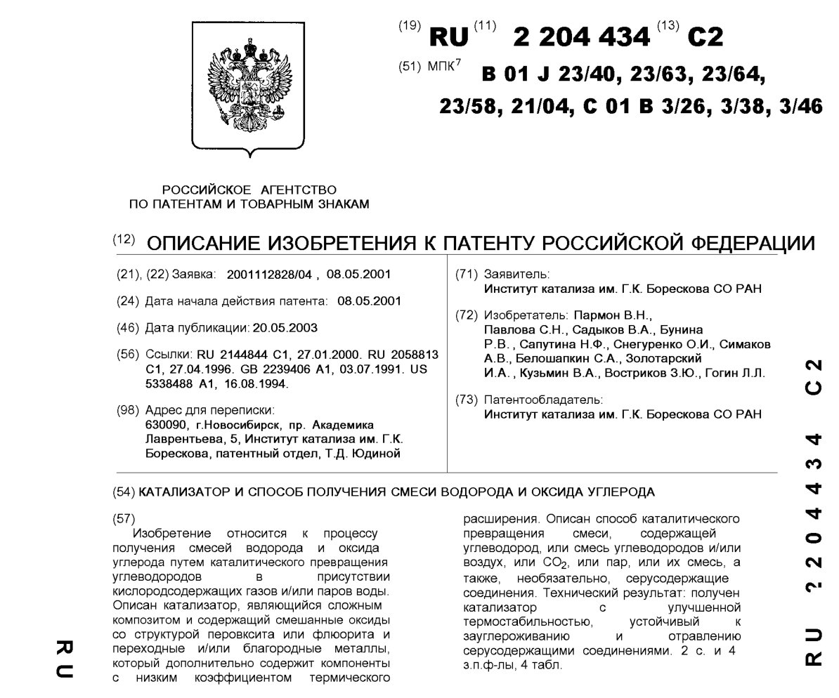- Пат. 2204434 Российской Федерации, МПК B01J 23/40, B01J 23/63, B01J 23/64, B01J 23/58, B01J 21/04, C01B 3/26, C01B 3/38, C01B 3/46. Катализатор и способ получения смеси водорода и оксида углерода / Пармон В.Н., Павлова С.Н., Садыков В.А., Бунина Р.В., Сапутина Н.Ф., Снегуренко О.И., Симаков А.В., Белошапкин С.А., Золотарский И.А., Кузьмин В.А., Востриков З.Ю., Гогин Л.Л.; патентообладатель Институт катализа СО РАН. - N 2001112828/04; заявл. 08.05.01; опубл. 20.05.03, Бюл. N 14, ч. ІІ. - 12 с.: ил.