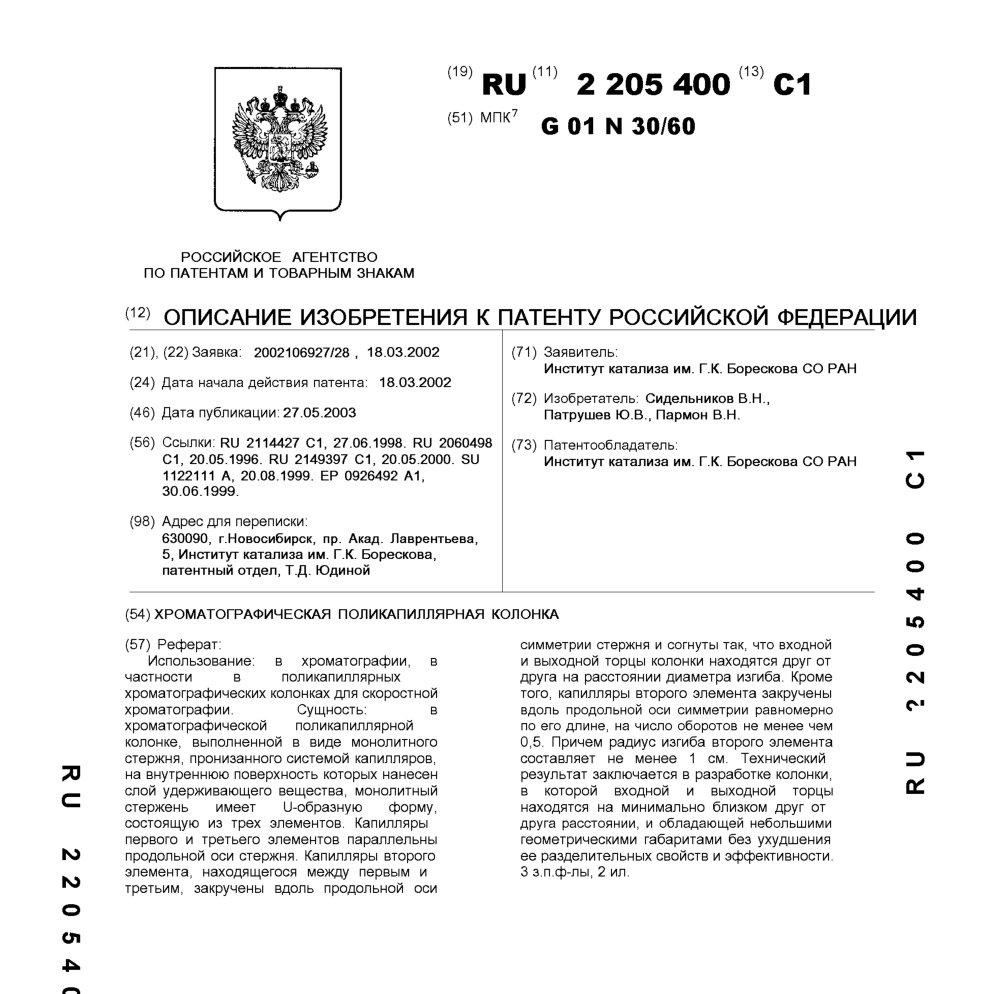 - Пат. 2205400 Российской Федерации, МПК G01N 30/60. Хроматографическая поликапиллярная колонка / Сидельников В.Н., Патрушев Ю.В., Пармон В.Н.; патентообладатель Институт катализа СО РАН. - N 2002106927/28; заявл. 18.03.02; опубл. 27.05.03, Бюл. N 15, ч. ІІ. - 6 с.: ил.