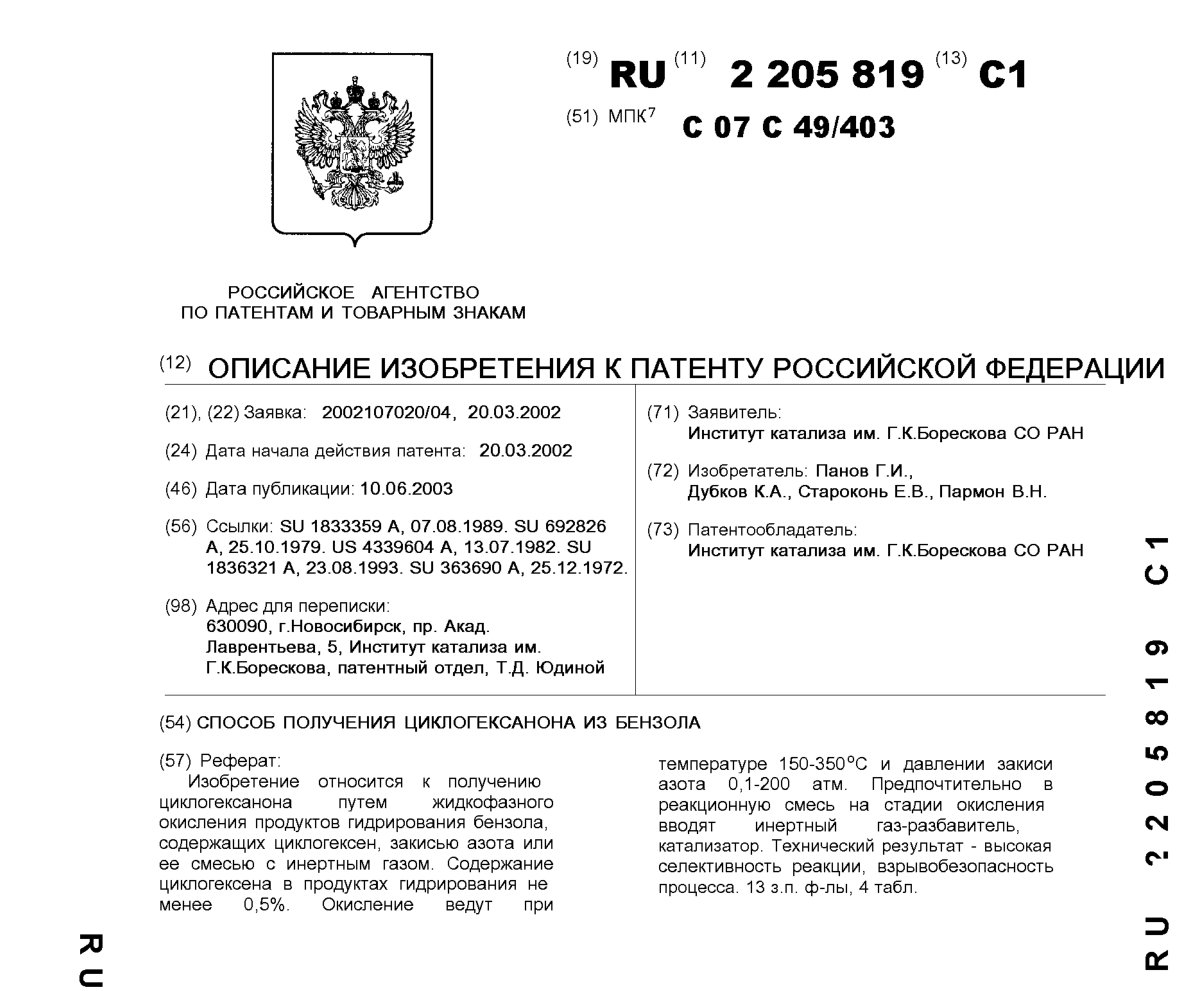 - Пат. 2205819 Российской Федерации, МПК C07C 49/403. Способ получения циклогексанона из бензола / Панов Г.И., Дубков К.А., Староконь Е.В., Пармон В.Н.; патентообладатель Институт катализа СО РАН. - N 2002107020/04; заявл. 20.03.02; опубл. 10.06.03, Бюл. N 16, ч. ІІ. - 11 с.: ил.