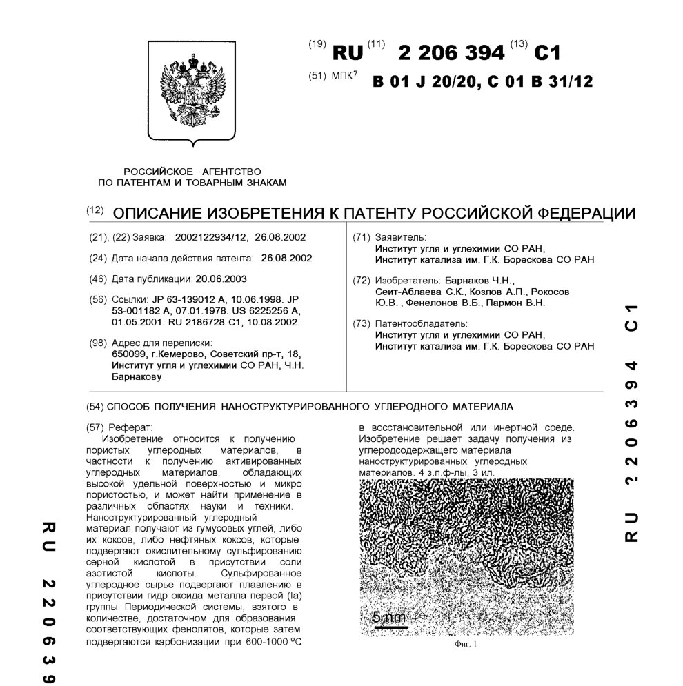 - Пат. 2206394 Российской Федерации, МПК B01J 20/20, C01B 31/12. Способ получения наноструктурированного углеродного материала / Барнаков Ч.Н., Сеит-Аблаева С.К., Козлов А.П., Рокосов Ю.В., Фенелонов В.Б., Пармон В.Н.; патентообладатели Институт угля и углехимии СО РАН, Институт катализа СО РАН. - N 2002122934/12; заявл. 26.08.02; опубл. 20.06.03, Бюл. N 17, ч. ІІI. - 7 с.: ил.