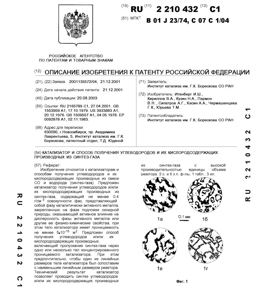- Пат. 2210432 Российской Федерации, МПК B01J 23/74, C07C 1/04. Катализатор и способ получения углеводородов и их кислородсодержащих производных из синтез-газа / Итенберг И.Ш., Кириллов В.А., Кузин Н.А., Пармон В.Н., Сипатров А.Г., Хасин А.А., Чермашенцева Г.К., Юрьева Т.М.; патентообладатель Институт катализа СО РАН. - N 2001135572/04; заявл. 21.12.01; опубл. 20.08.03, Бюл. N 23, ч. ІIІ. - 14 с.: ил.