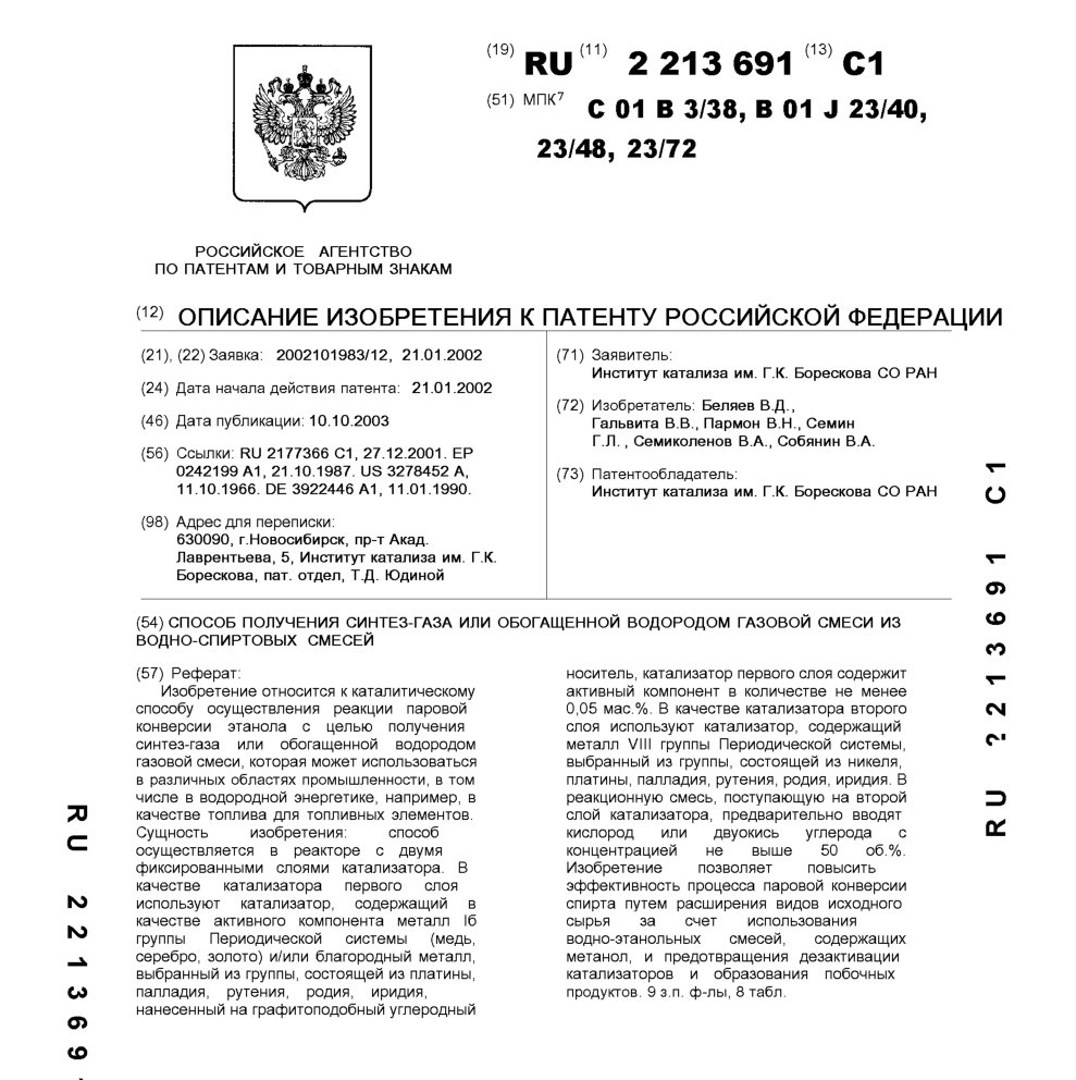- Пат. 2213691 Российской Федерации, МПК C01B 3/38, B01J 23/40, B01J 23/48, B01J 23/72. Способ получения синтез-газа или обогащенной водородом газовой смеси из водно-спиртовых смесей / Беляев В.Д., Гальвита В.В., Пармон В.Н., Семин Г.Л., Семиколенов В.А., Собянин В.А.; патентообладатель Институт катализа СО РАН. - N 2002101983/12; заявл. 21.01.02; опубл. 10.10.03, Бюл. N 28, ч. ІІ. - 10 с.: ил.