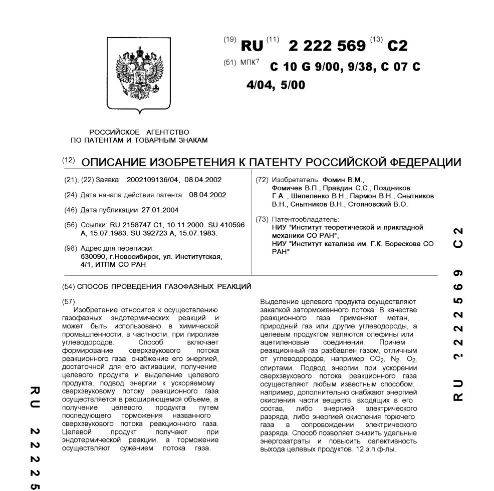 - Пат. 2222569 Российской Федерации, МПК C10G 9/00, C10G 9/38, C07C 4/04, C07C 5/00. Способ проведения газофазных реакций / Фомин В.М., Фомичев В.П., Правдин С.С., Поздняков Г.А., Шепеленко В.Н., Пармон В.Н., Снытников В.Н., Снытников В.Н., Стояновский В.О.; патентообладатели Институт теоретической и прикладной механики СО РАН, Институт катализа СО РАН. - N 2002109136/04; заявл. 08.04.02; опубл. 27.01.04, Бюл. N 3, ч. ІІI. - 6 с.