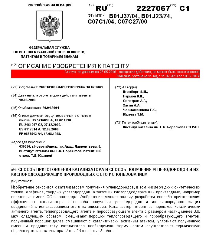 - Пат. 2227067 Российской Федерации, МПК B01J 37/04, B01J 23/74, C07C 1/04, C 07 C 27/00. Способ приготовления катализатора и способ получения углеводородов и их кислородсодержащих производных с его использованием / Итенберг И.Ш., Пармон В.Н., Сипатров А.Г., Хасин А.А., Чермашенцева Г.К., Юрьева Т.М.; патентообладатель Институт катализа СО РАН. - N 2003103899/04; заявл. 10.02.03; опубл. 20.04.04, Бюл. N 11, ч. ІІI. - 8 с.